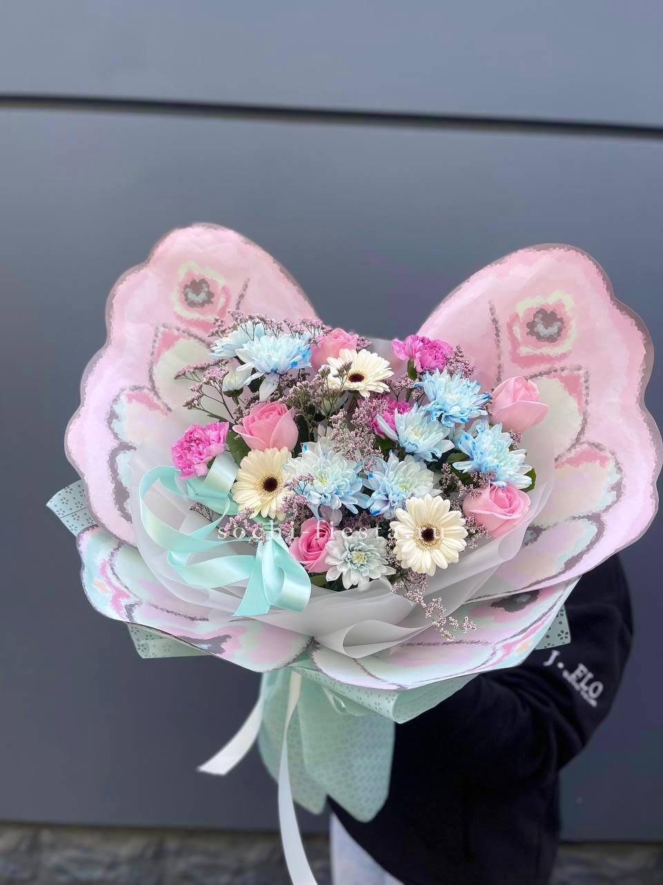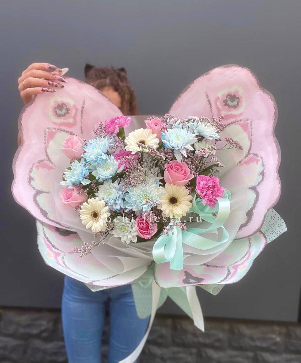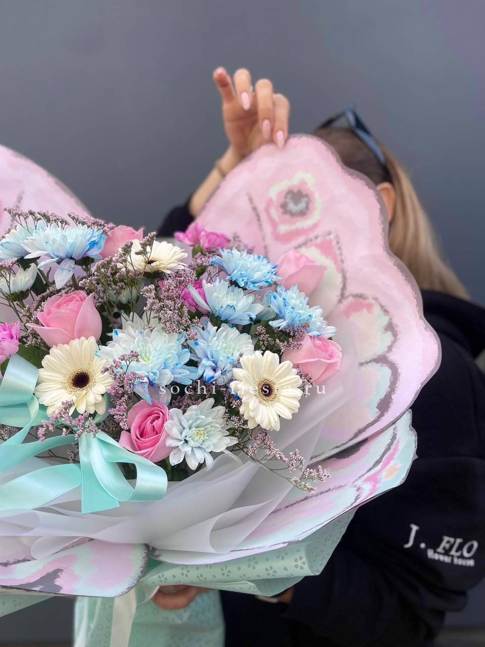 Авторский букет в составе которого: голубая хризантема, розовые розы, герберы, диантусы, лимониум, лента и дизайнерская упаковка бабочка.