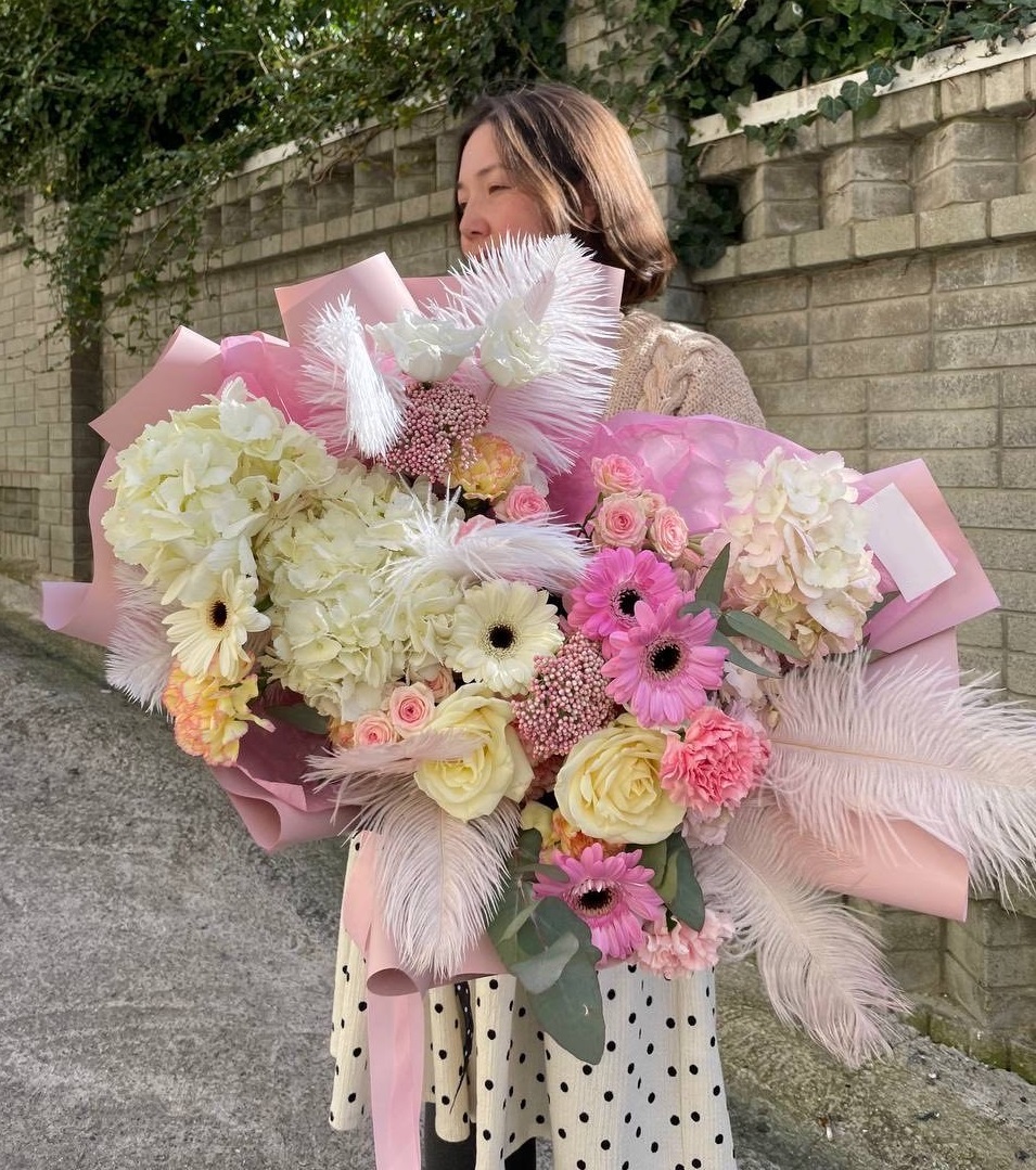 Состав: гортензии, роза одноголовая, роза кустовая, гербера, озотамнус, диантус, эвкалипт, декоративные перья, лента, дизайнерская упаковка