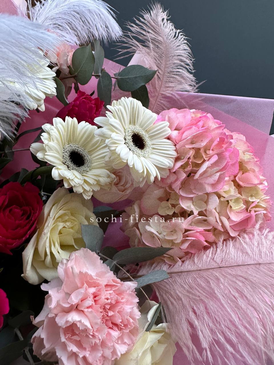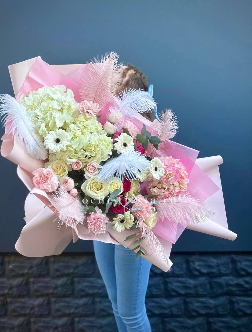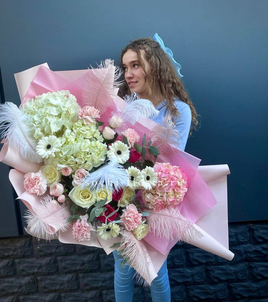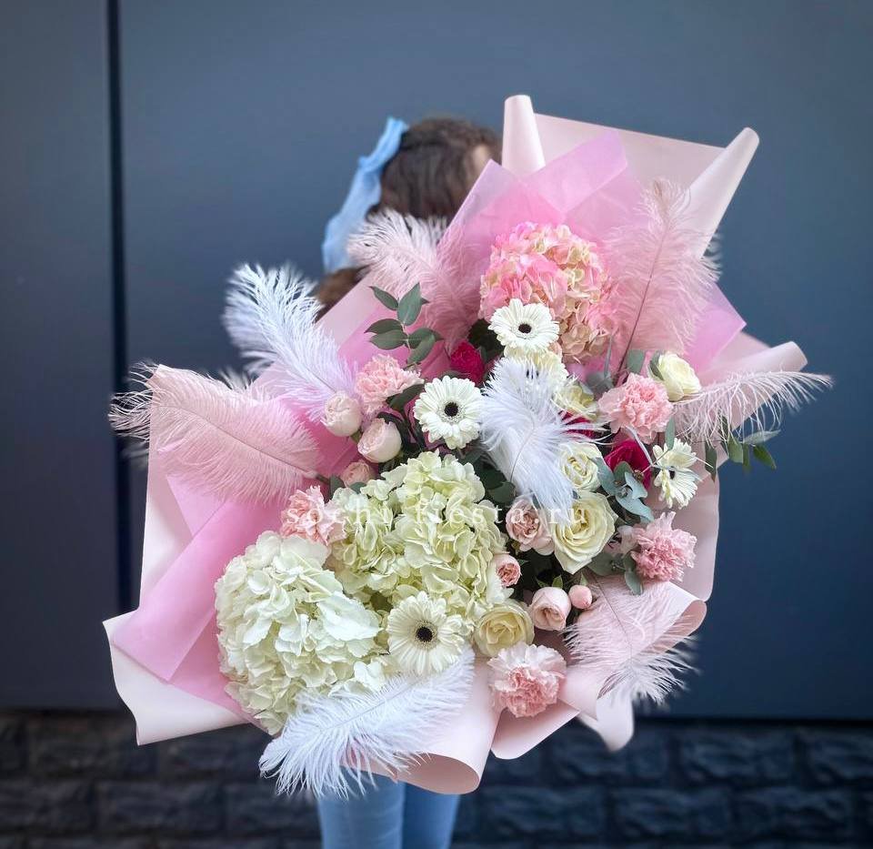 Состав: гортензии, роза одноголовая, роза кустовая, гербера, озотамнус, диантус, эвкалипт, декоративные перья, лента, дизайнерская упаковка