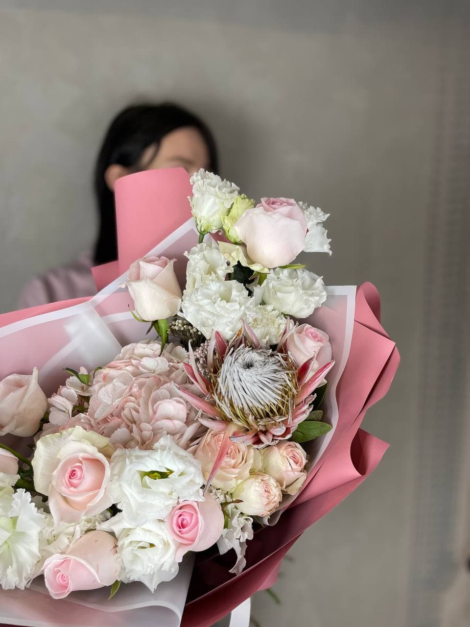 Состав: гортензия, кустовая пионовидная роза, протея, эустома, озотамнус, дизайнерское оформление