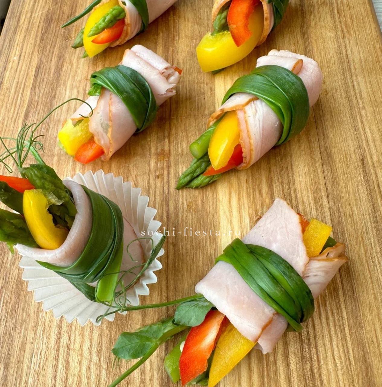 Конвертики с овощами и ветчиной. - 5 шт. Мини тосты с лососем, редисом и лимоном - 5 шт. Тарталетки с рийетом из лосося - 5 шт. Яйцо в пикантной начинкой из сыра - 5 шт