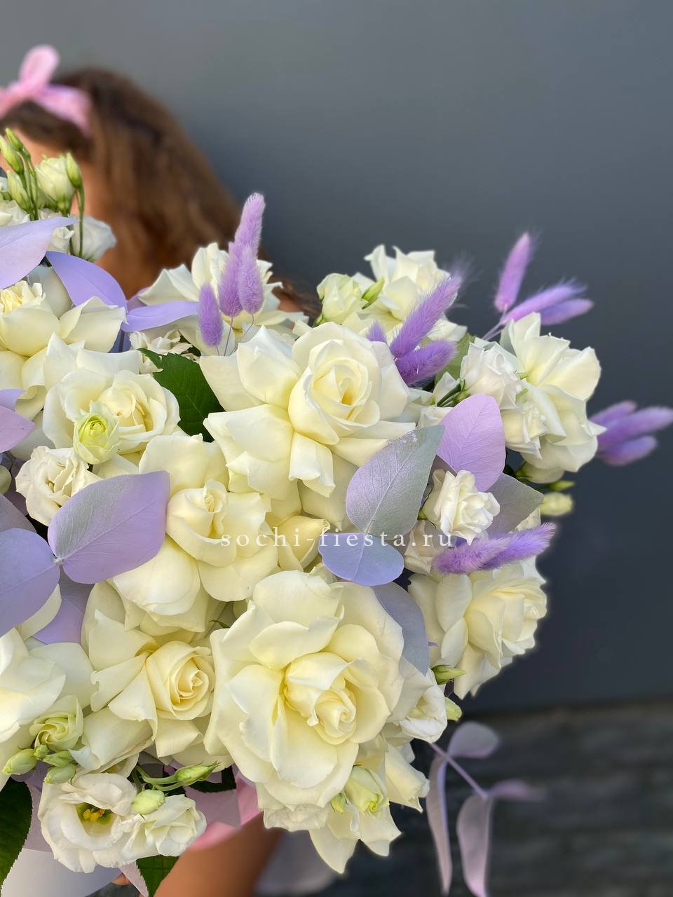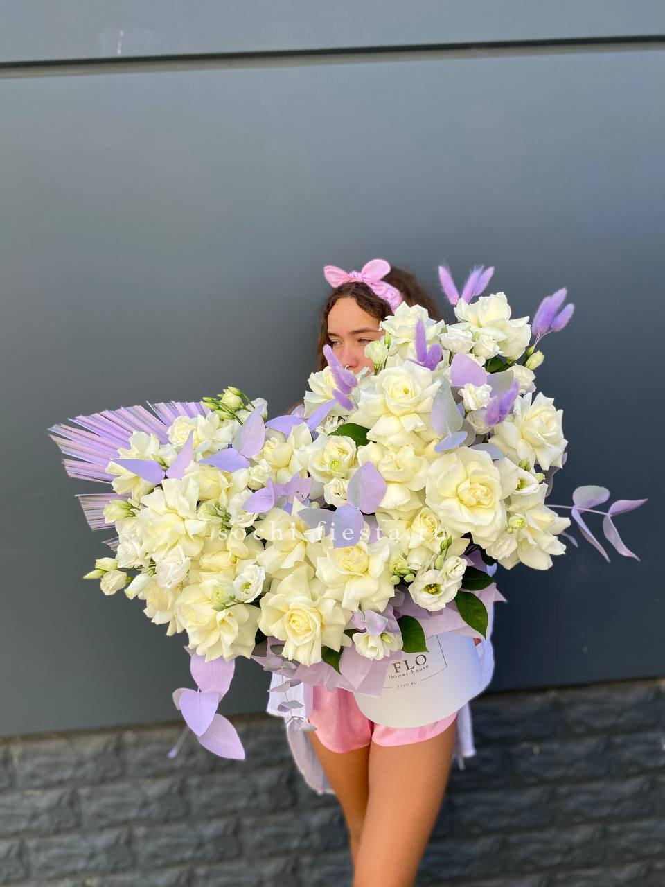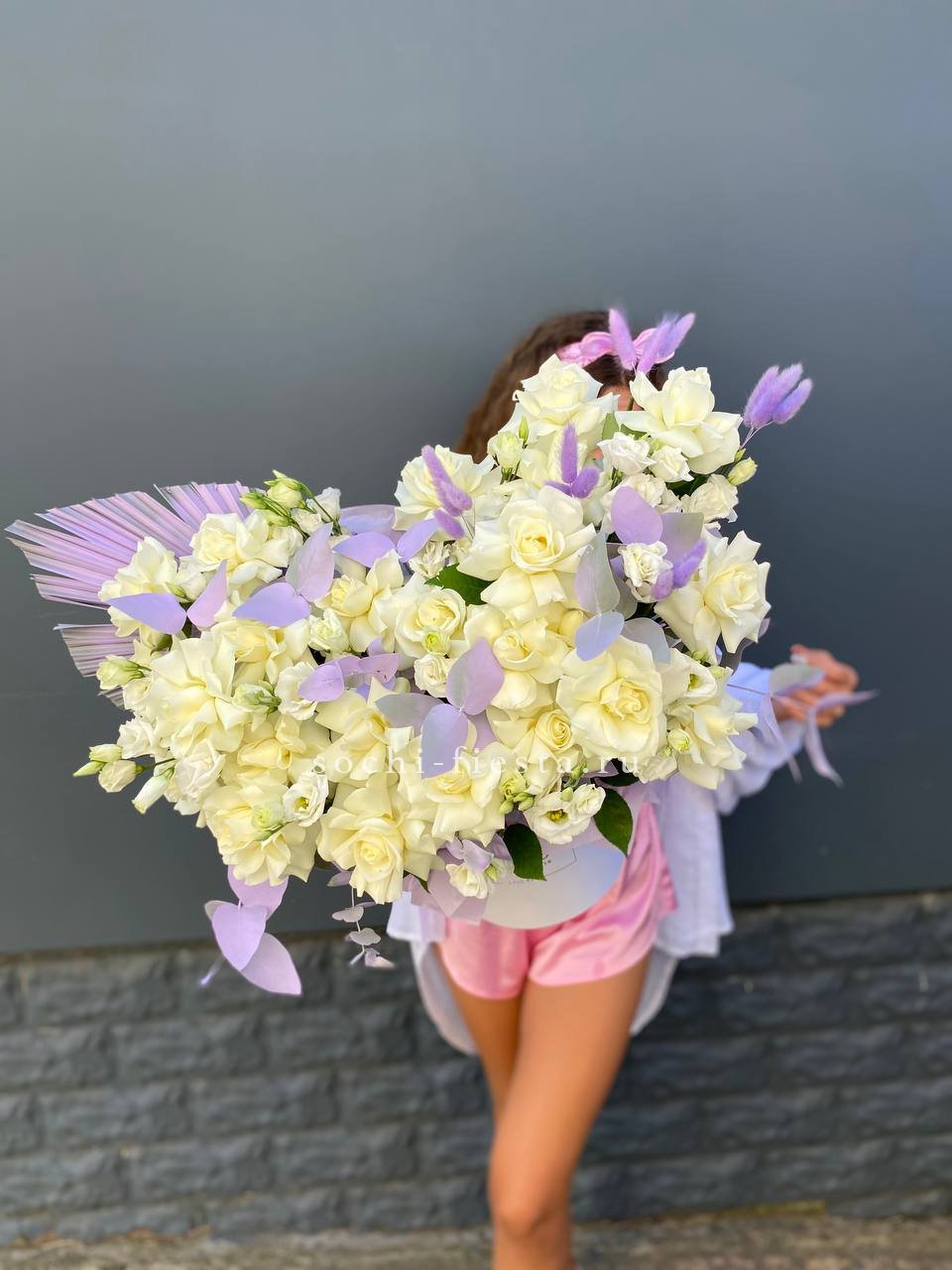 Состав: бокс 20D, белая французская роза, эустома, эвкалипт