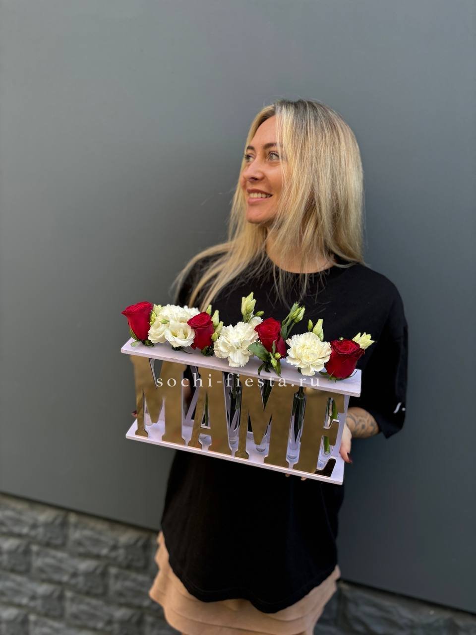Состав: розы. диантусы, эустома, деревянный ящик с колбами