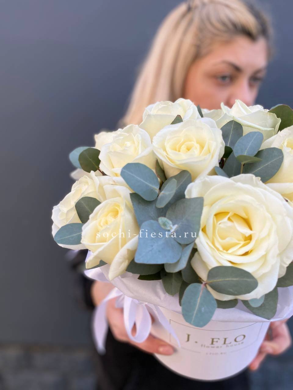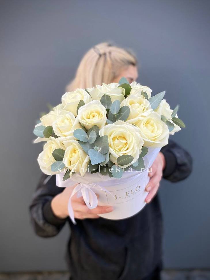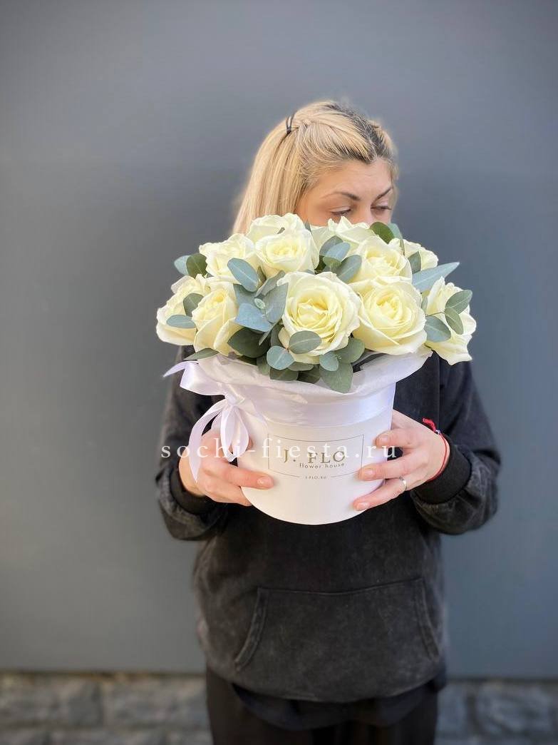 Состав: белые розы с эвкалиптом в боксе 16