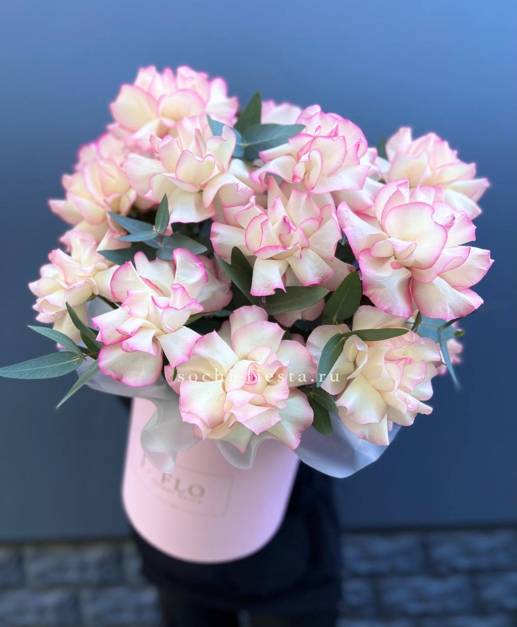 Состав: вывернутые  розы Джумилия - 15 шт., цилиндр D20, эвкалипт, лента, упаковка