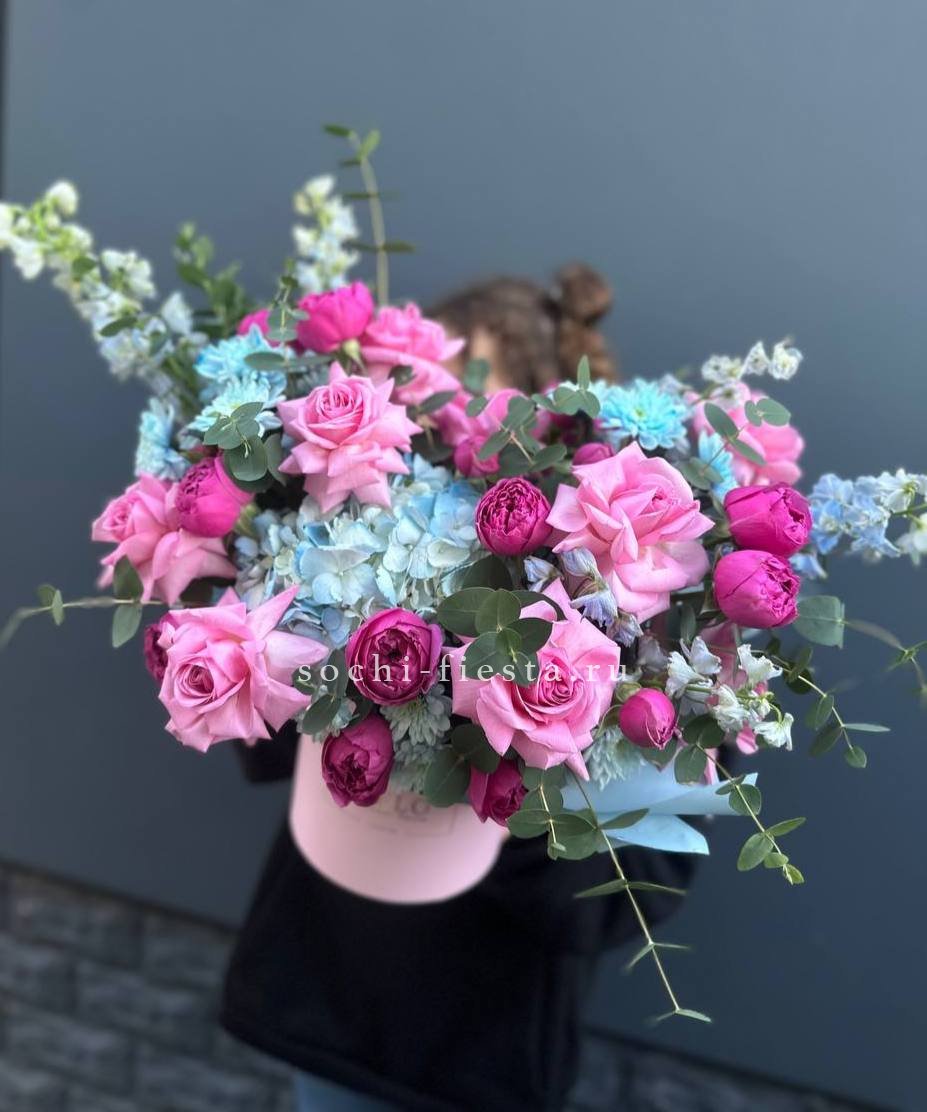 Состав: гортензия,  розы, маттиола или дельфиниум, хризантемы, пионовидные розы, эвкалипт,  цилиндр D16