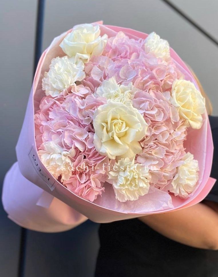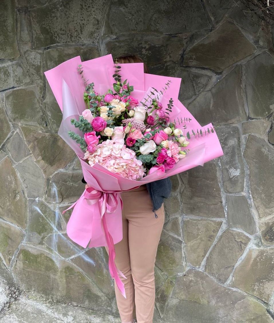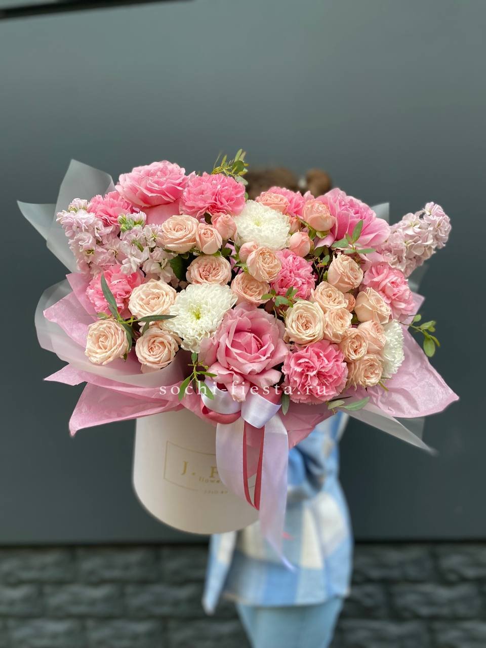 Состав: розовые французские розы, маттиола, кустовые розы, диантусы, хризантема, цилиндр D20.