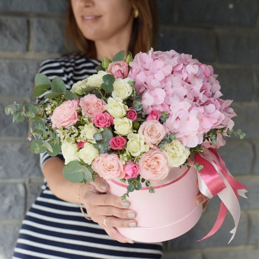 Настоящий цветочный фейерверк в стильной коробке! Эта пышная и многосоставная композиция притягивает взгляды богатством форм и оттенков — от кремового и персикового до насыщенного розового и белого. Это не просто цветы, а целая история о радости, празднике и восхищении. Подарок, который гарантированно произведет яркое впечатление и останется в памяти надолго.