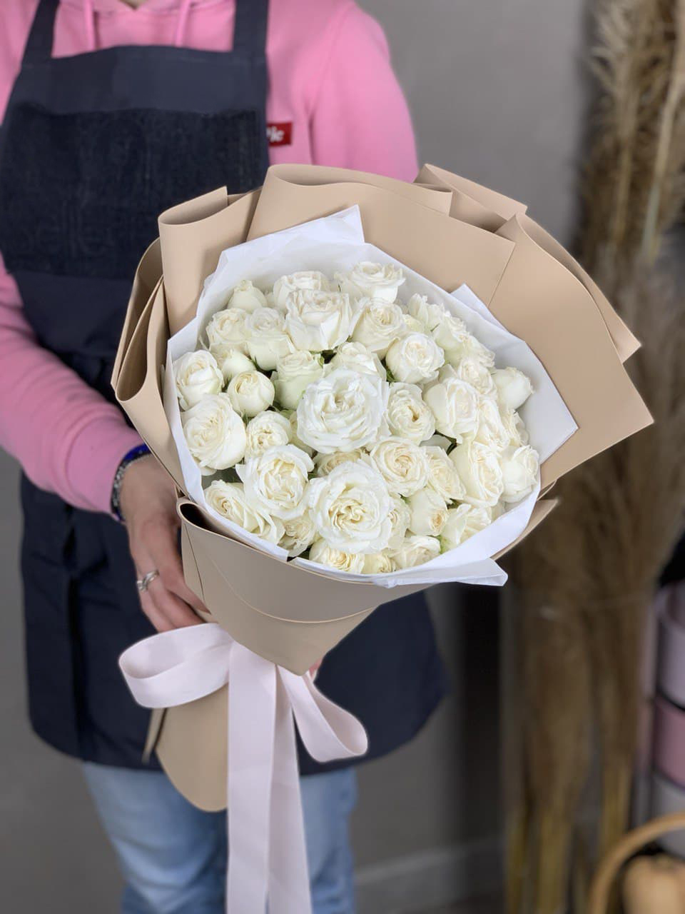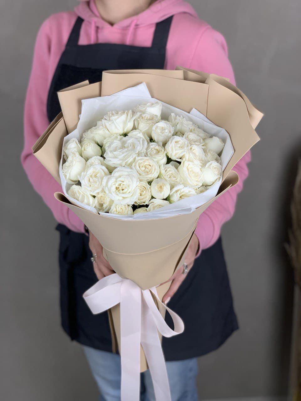 Состав: пионовидная кустовая роза бомбастик - 19 шт.,эустома 6шт., лента, цилиндр D20