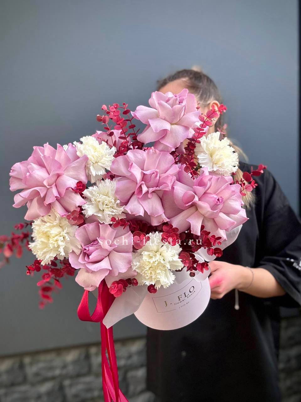 Состав: розовая роза 7, диантус 6, бокс 16, эвкалипт