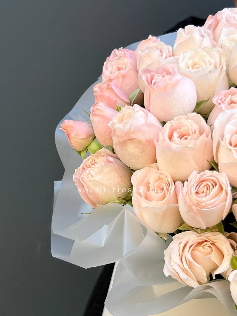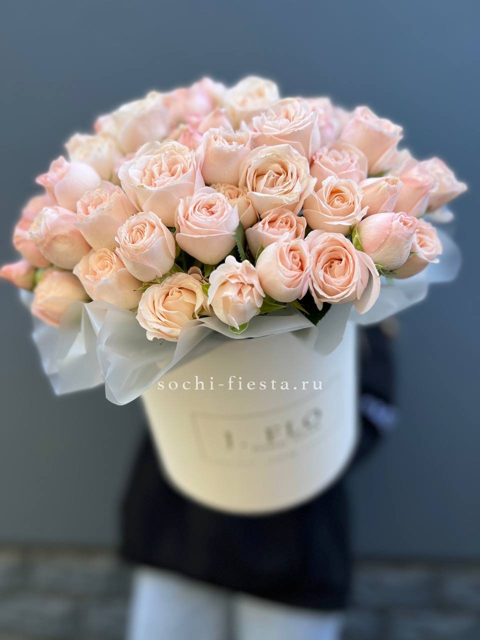 Состав: пионовидная кустовая роза бомбастик - 31 веточек, эвкалипт, лента, цилиндр D20