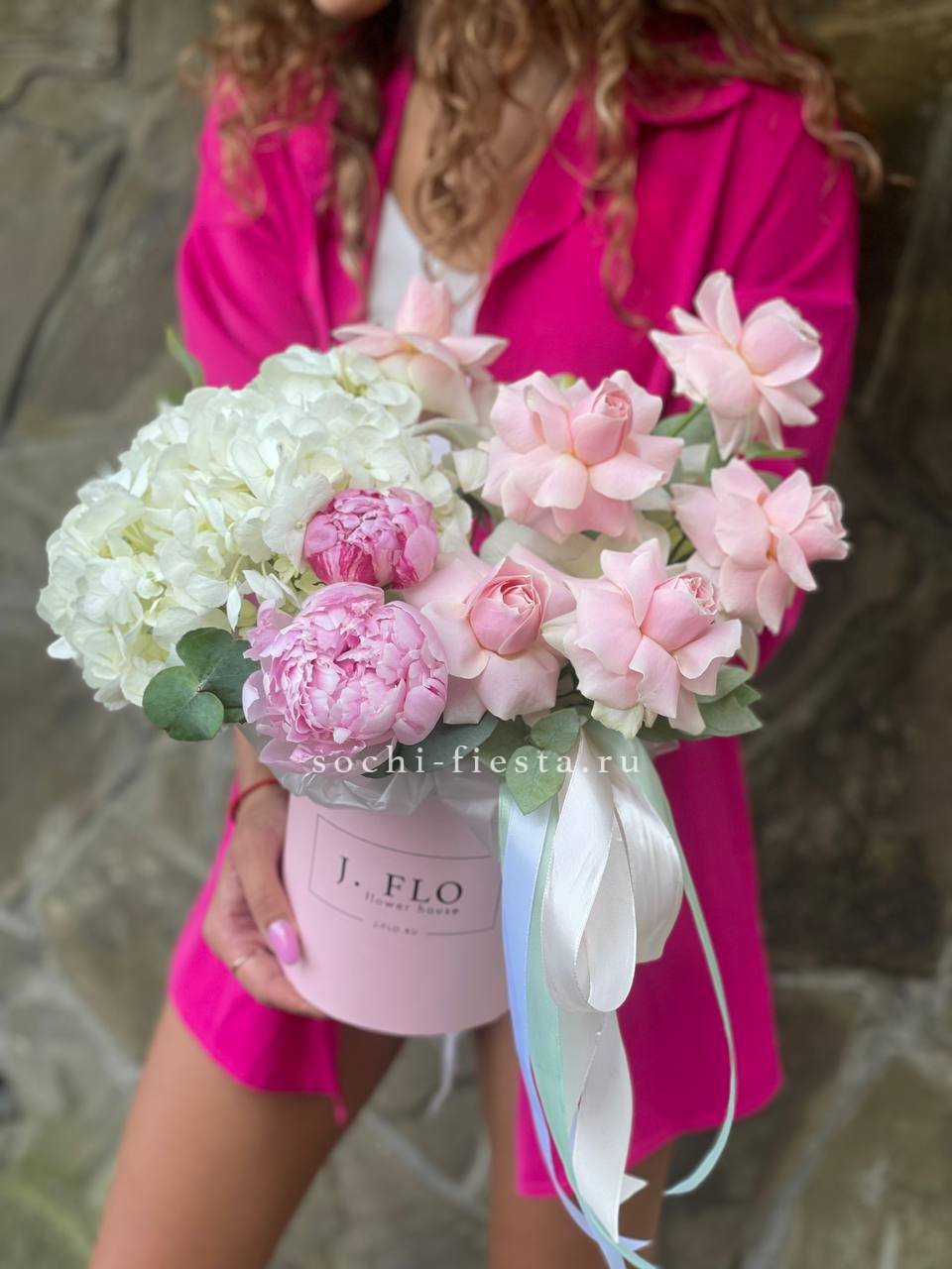 Состав: гортензии, пионы, розы, лилии,  лента, цилиндр D16.