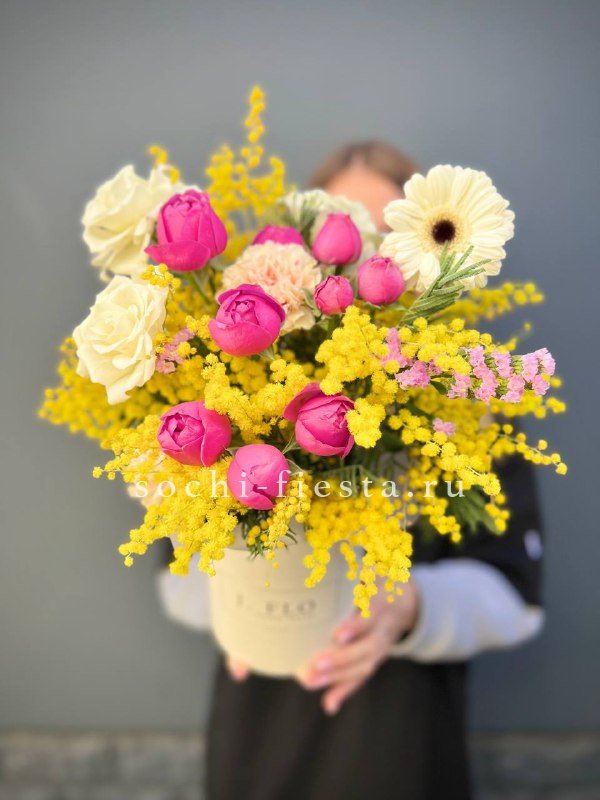 Состав: мимоза, пионовидные розы, розы, герберы, диантусы, статица,  цилиндр D13, упаковка