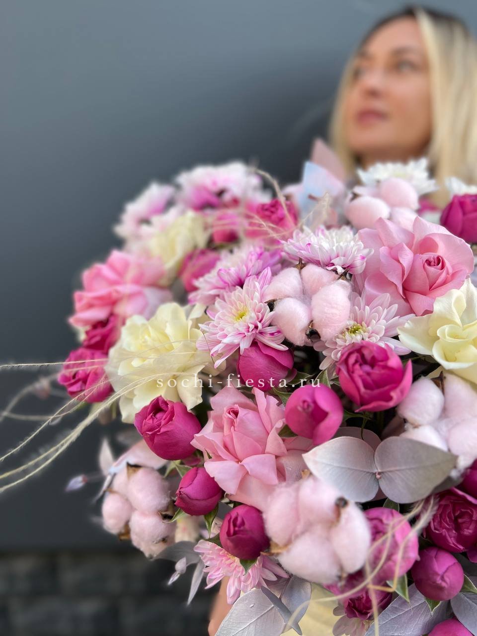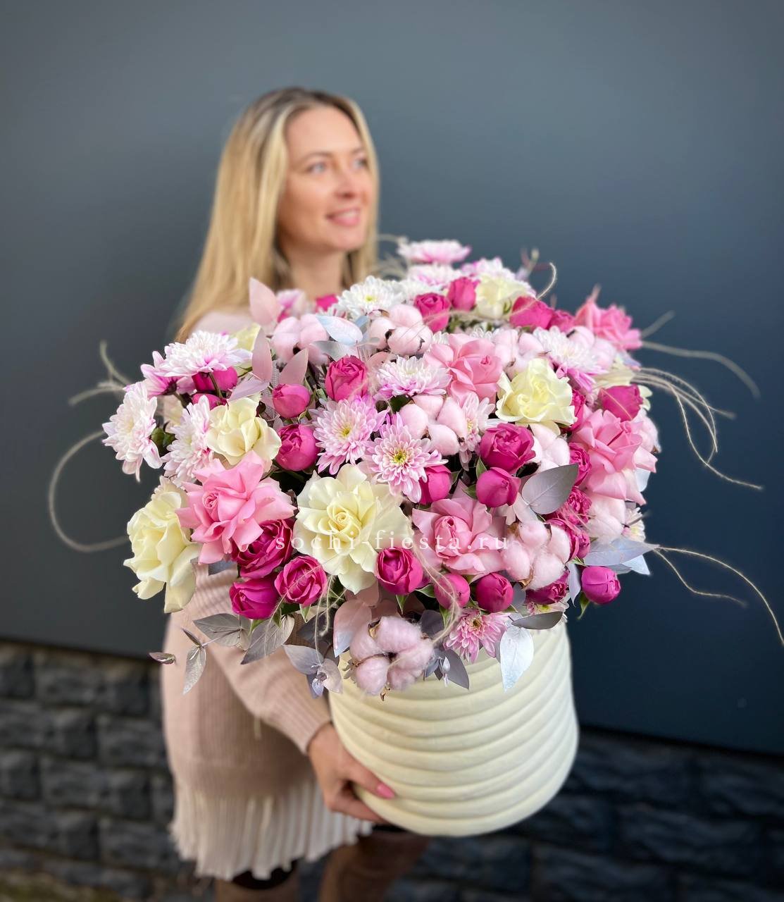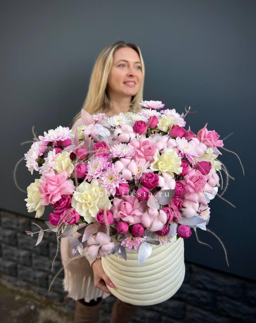Состав: пионовидная кустовая роза, хлопок, одноголовая роза, кустовая хризантема, ковыль(стифа), эвкалипт, бокс D25
