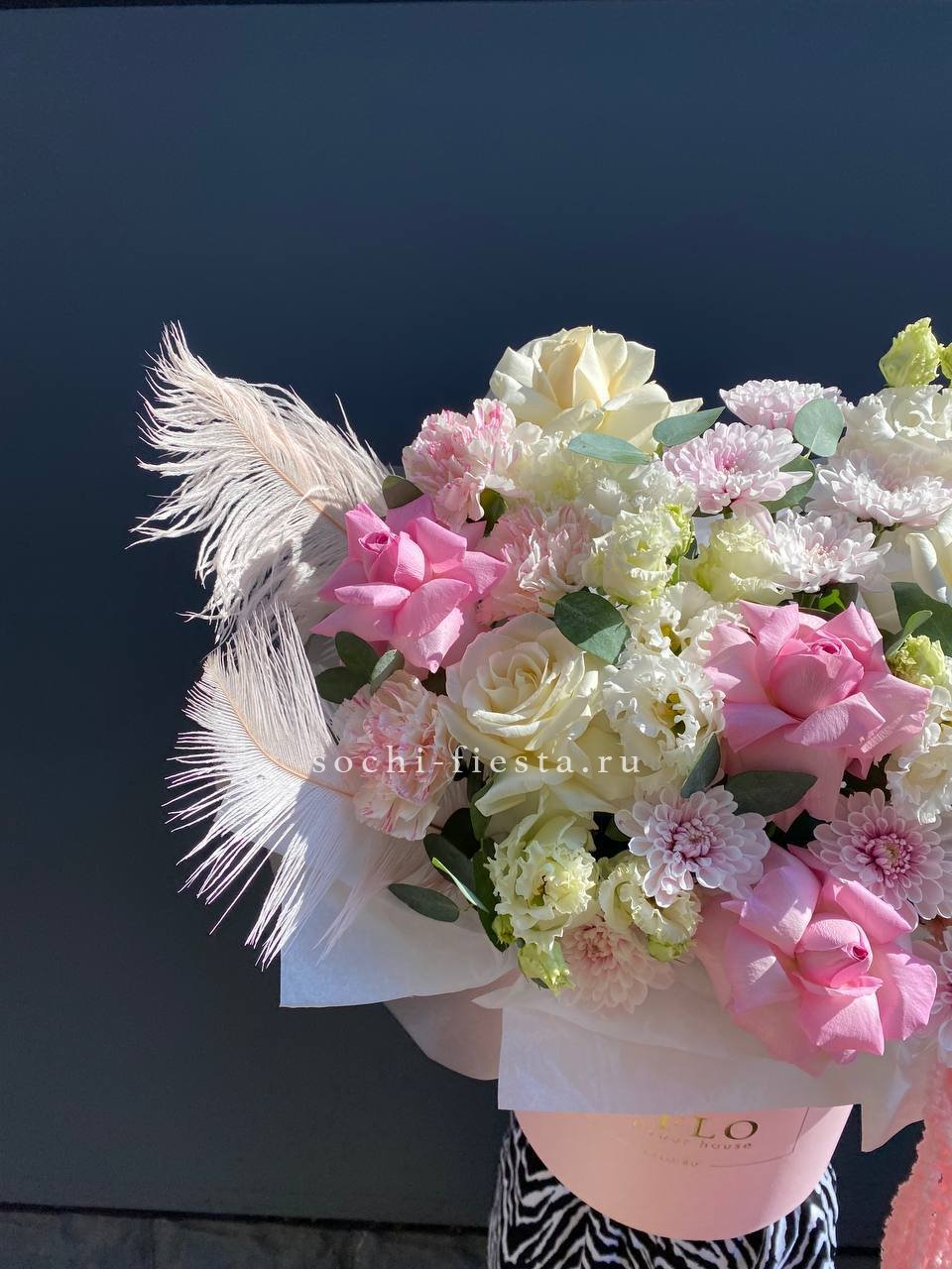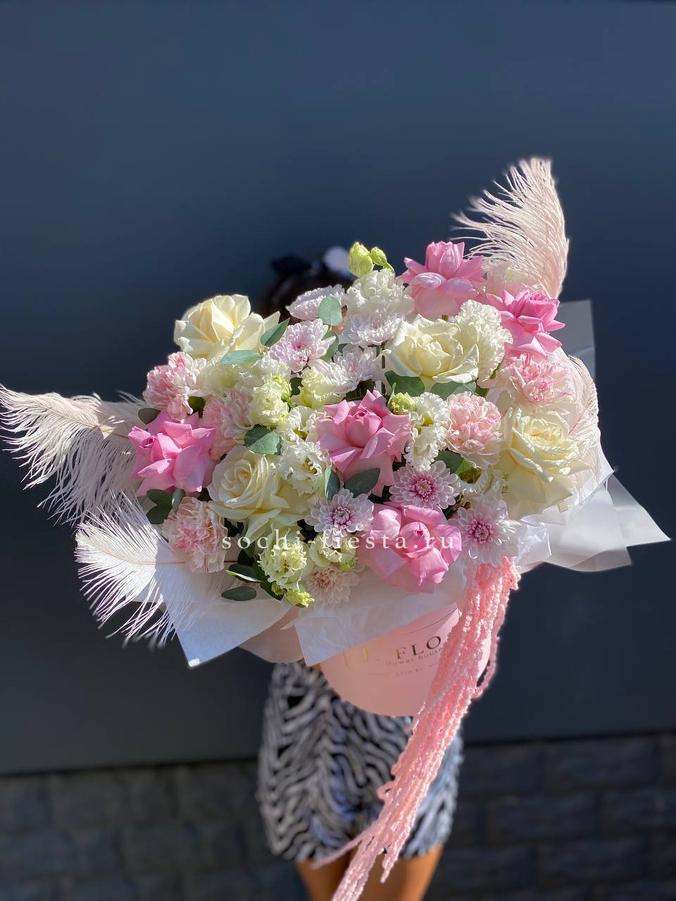 Дизайнерский бокс в составе которого: французские розы, диантусы, хризантемы,  эустома, амарантус, перья