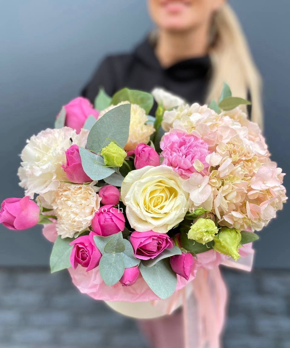 Состав: гортензия, кустовые розы, диантус, мисти баблс, эвкалипт, лента, цилиндр D16