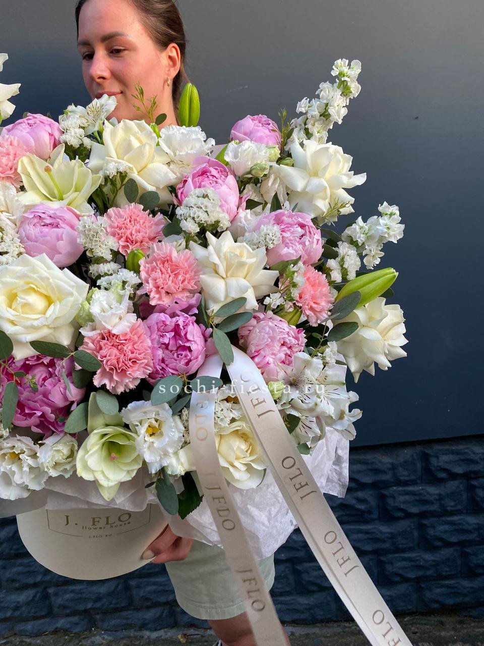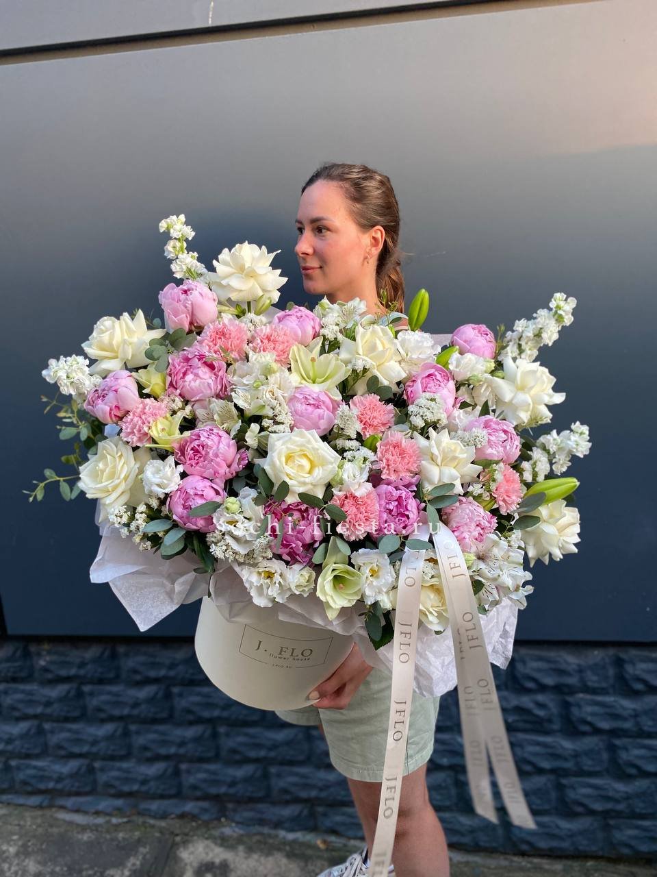Состав: пионы, лилии, белые розы, эустомы, диантусы, маттиолы, статица, альстромерия, эвкалипт, цилиндр - D25, лента, упаковка. Состав может меняться в зависимости от сезона.