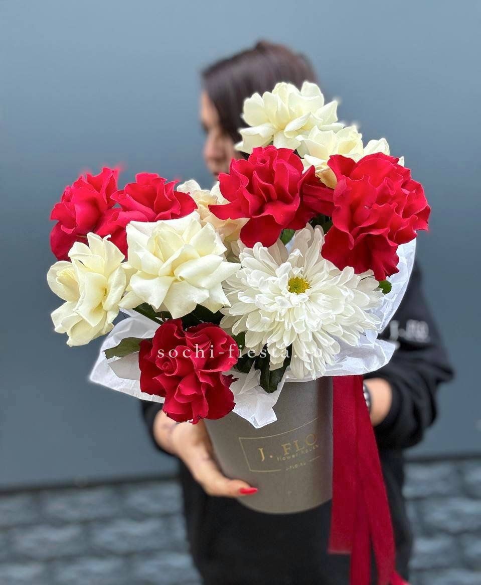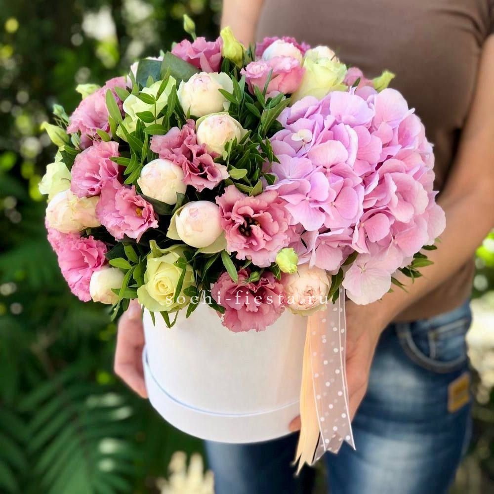 Состав: гортензия, пионовидные розы, одноголовые розы, диантус, герберы, георгины, цилиндр D 40