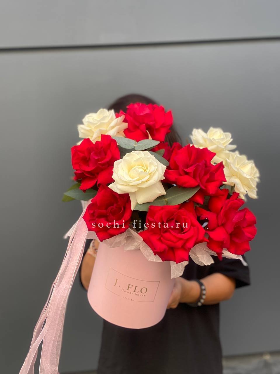 Состав:  белые розы - 4 шт.,красные розы 9 шт., цилиндр D16,  лента