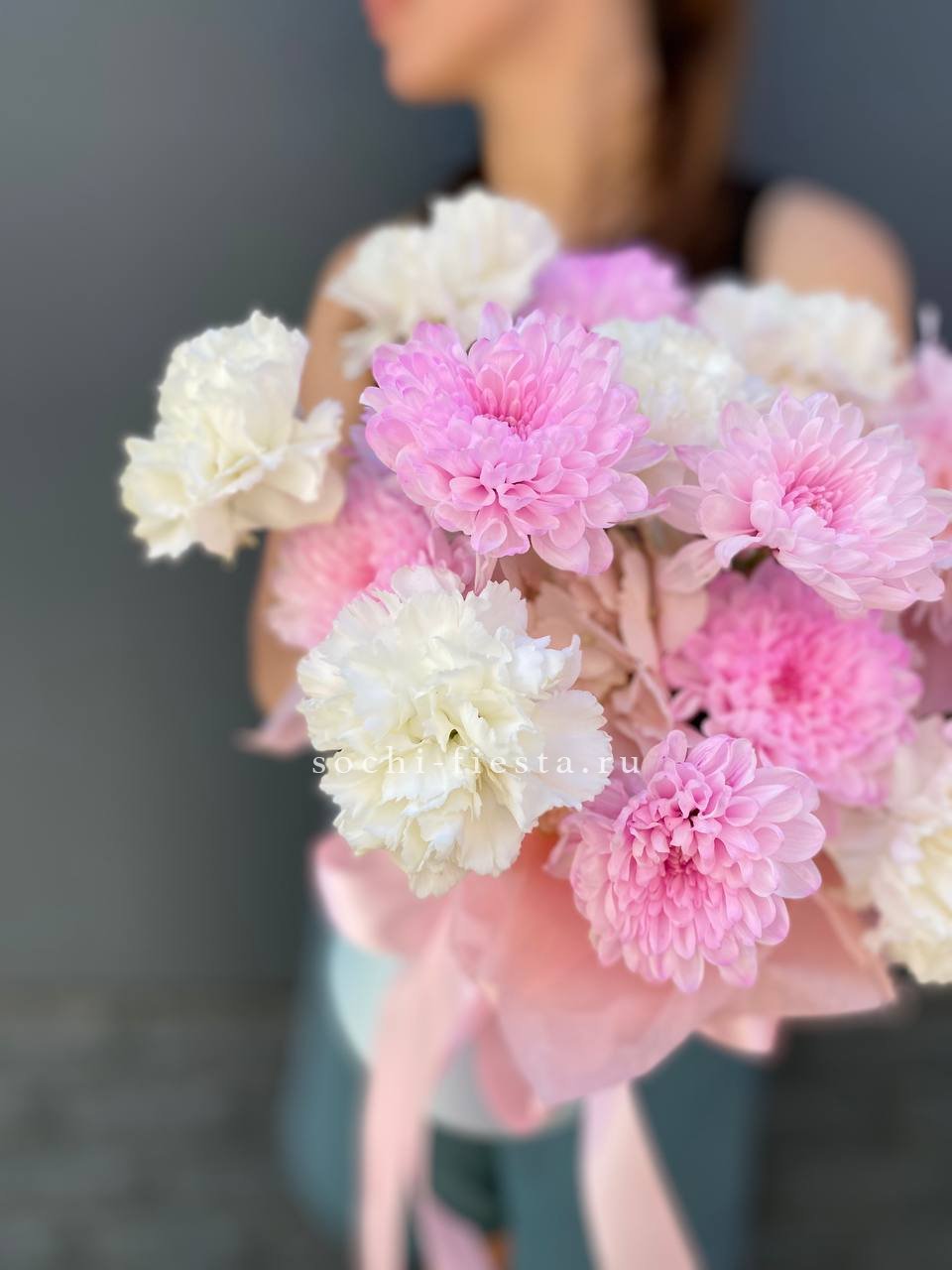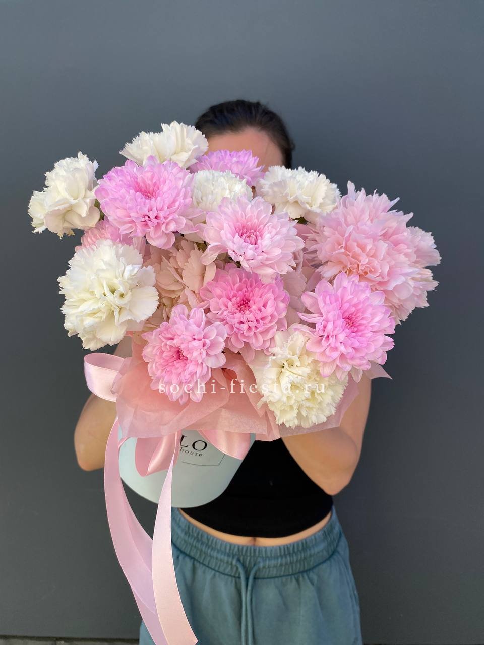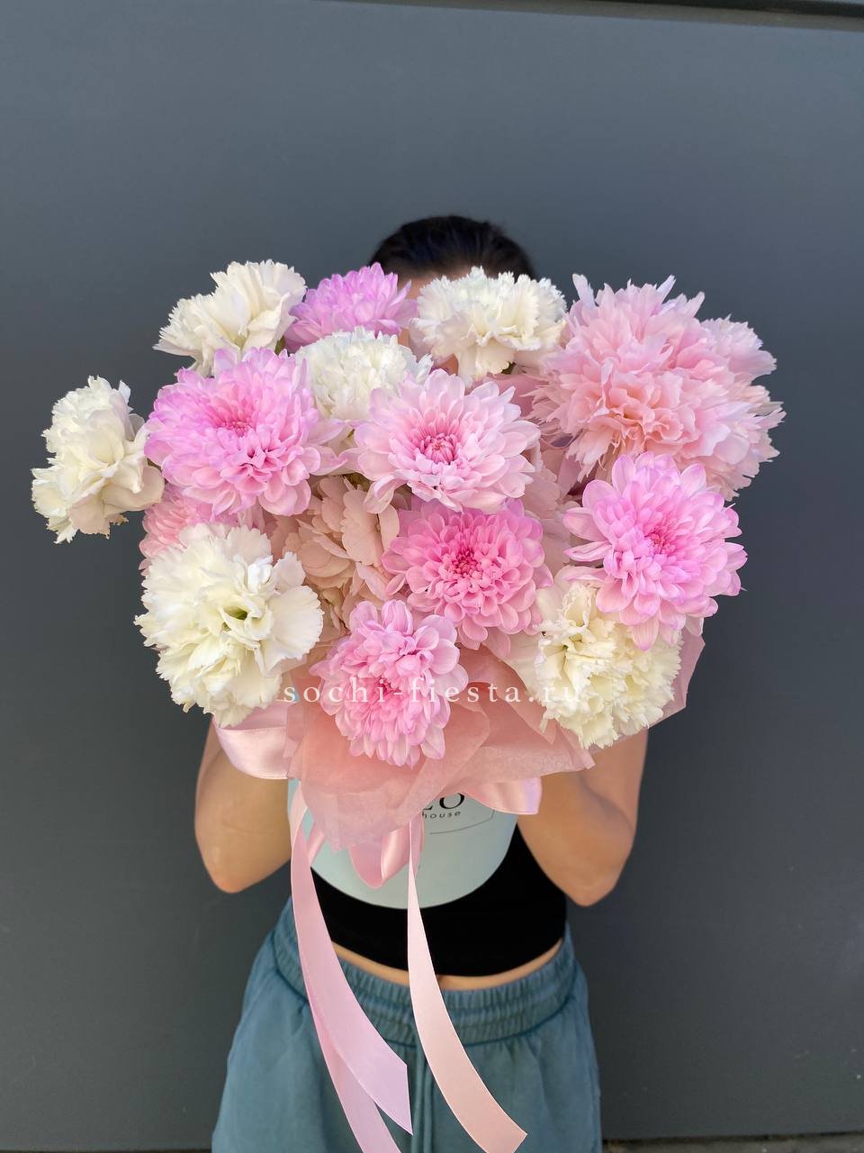 Состав: хризантемы, диантусы, пионы, цилиндр D13, эвкалипт, лента, тишью.