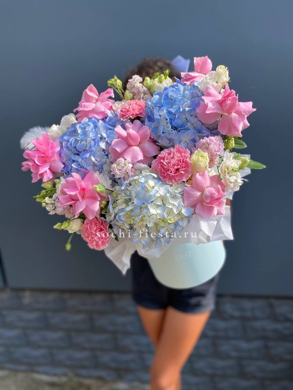 Состав: гортензии, розовые розы, маттиола (аналог), эустомы, перо, диантусы,  цилиндр D20, лента, упаковка
