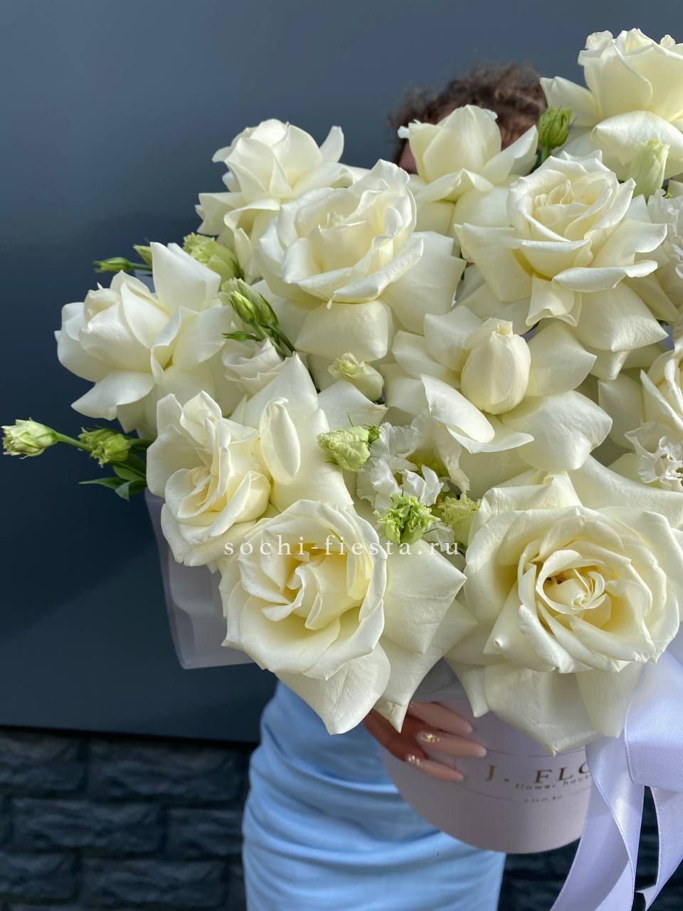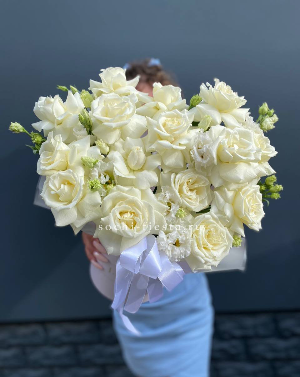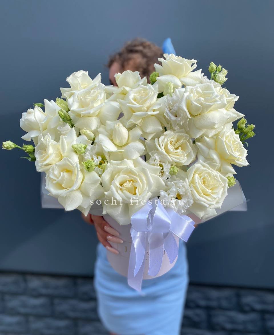 Состав: белые розы, эустома, цилиндр D13, эвкалипт, лента, упаковка.