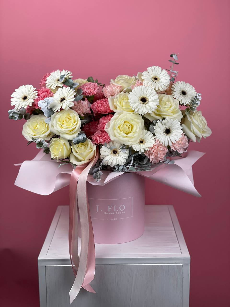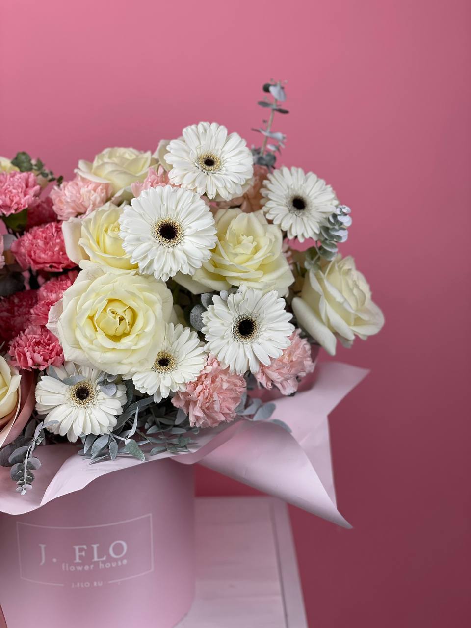 Три оттенка в одной композиции: чистота белых роз, яркость гербер и воздушность диантусов. Эвкалипт создаёт мягкий фон для каждого цветка.