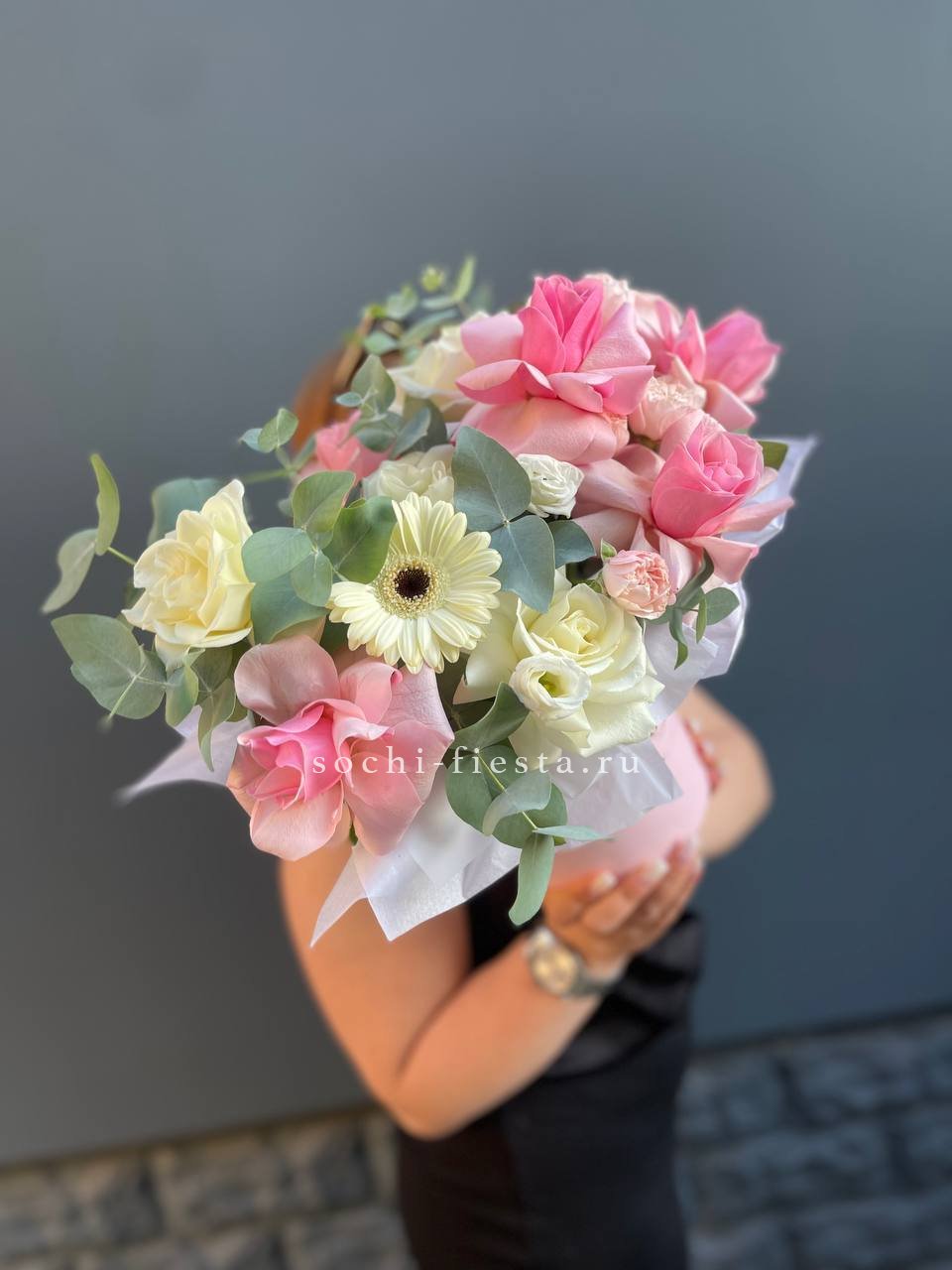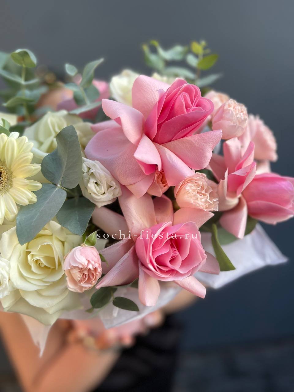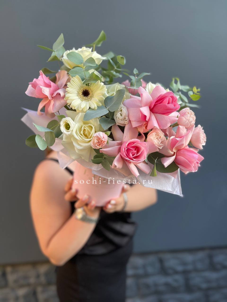 Состав: гербера, розовая роза, бомбастик, белая роза, эустома, бокс 13
