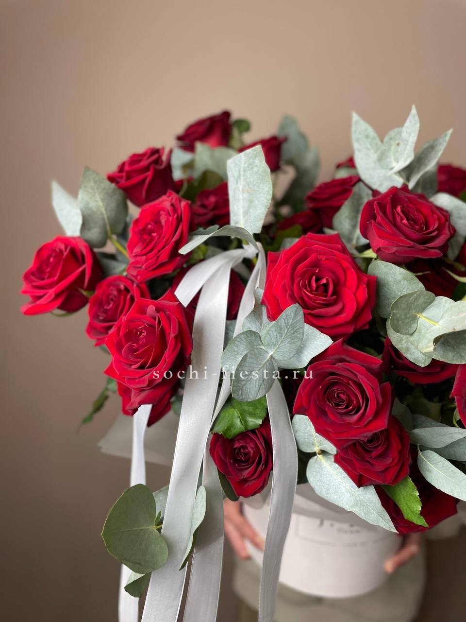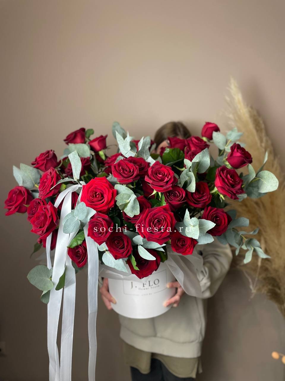 Состав: красные розы - 45 шт., эвкалипт, цилиндр D20, лента