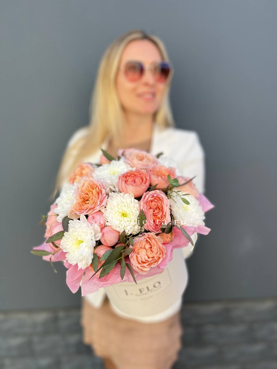 Состав: кустовые пионовидные розы джульетта, хризантемы, эвкалипт, цилиндр D16, бумага тишью, лента.