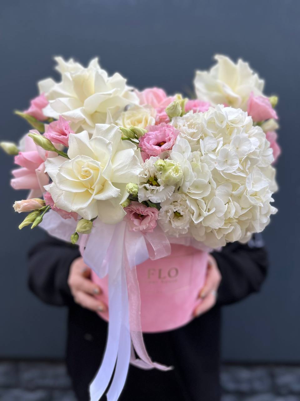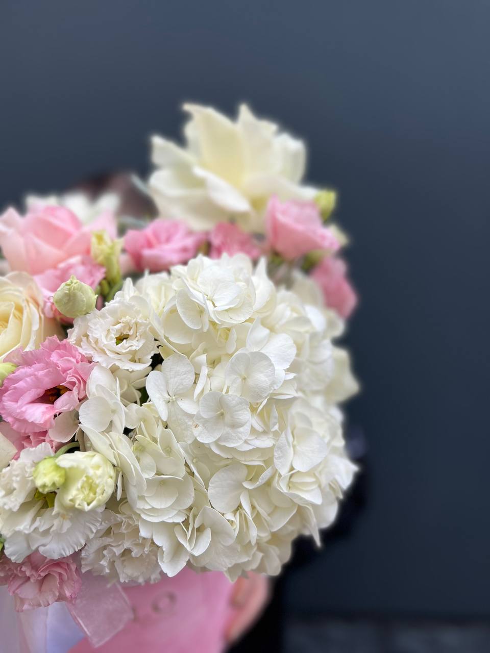 Воздушная композиция в бархатной коробке раскрывается пышными соцветиями гортензии и многолепестковыми бутонами эустомы. Розы двух оттенков создают мягкий переход от белоснежного к пудровому. Флористическая пена сохраняет свежесть каждого цветка надолго.