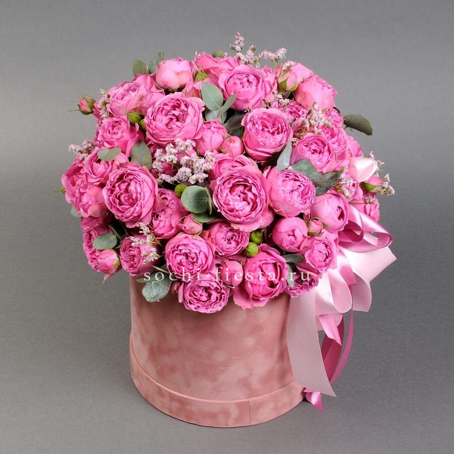 Нежный бокс в составе которого: хризантемы, кустовые розы, лимониум, эустома и эвкалипт.