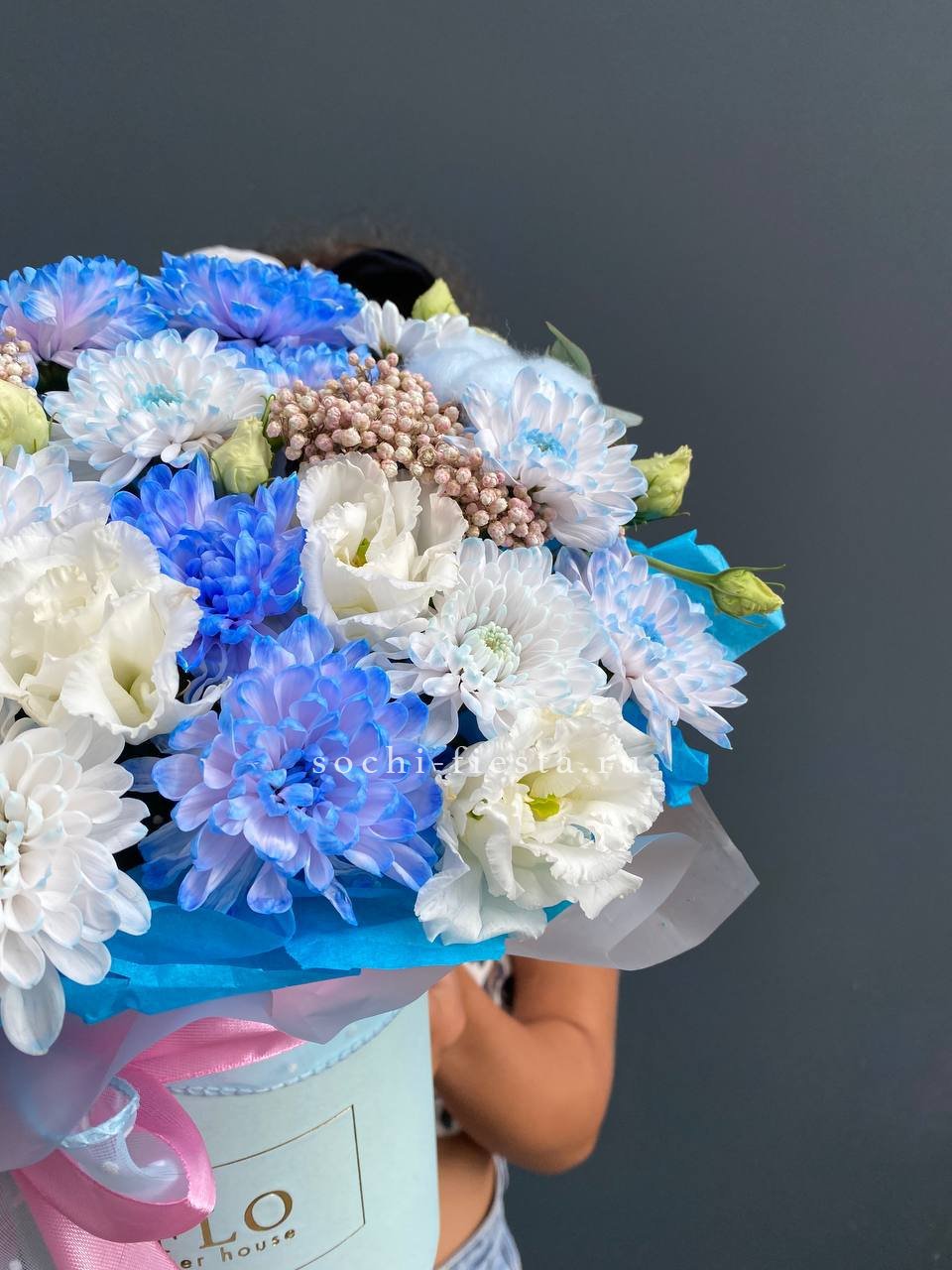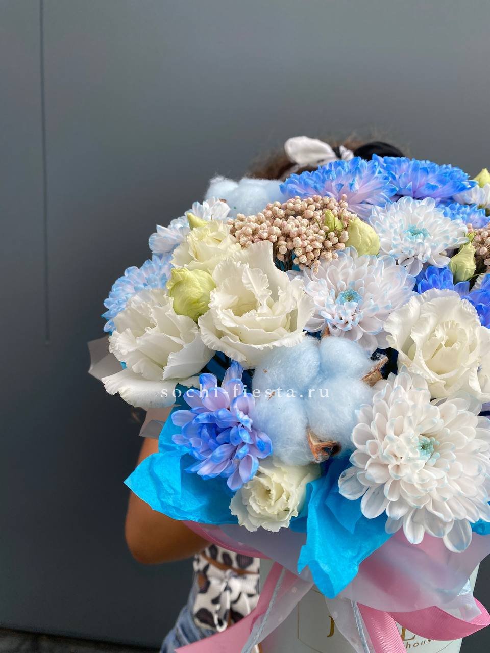Состав коробки : хризантема кустовая, озотамус, эустома, хлопок