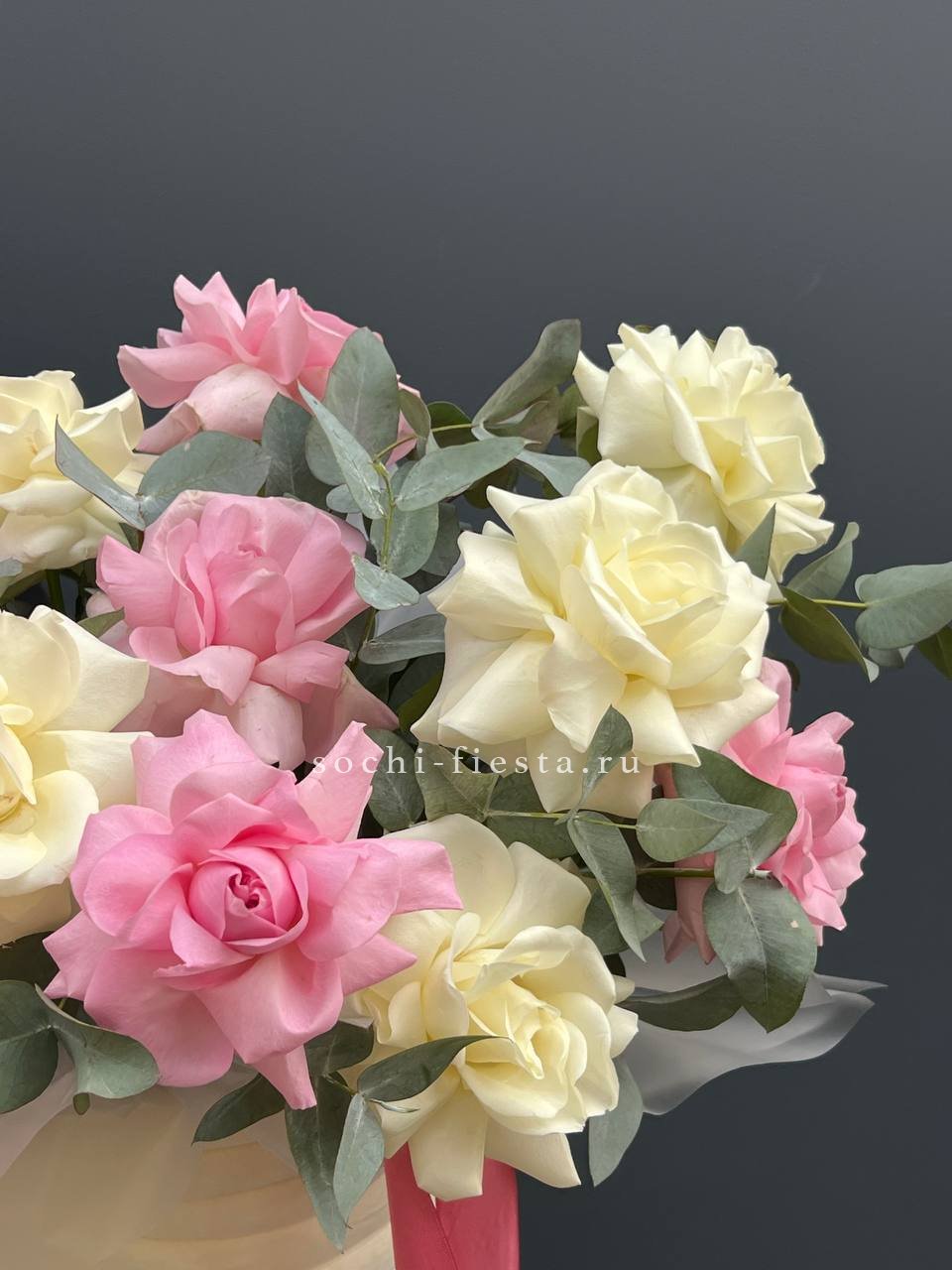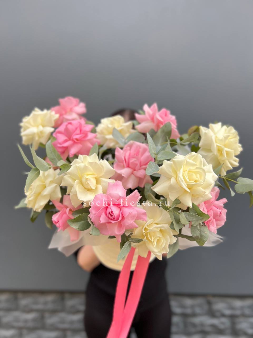 Состав: 17 французских роз, эвкалипт, цилиндр.