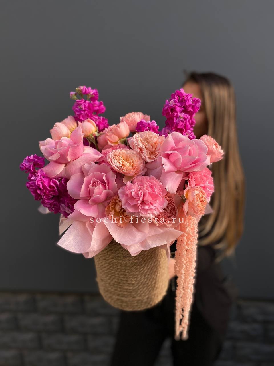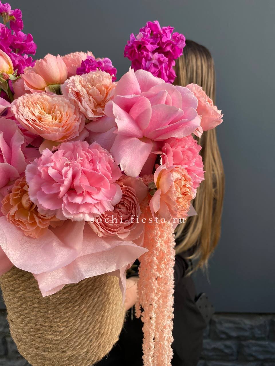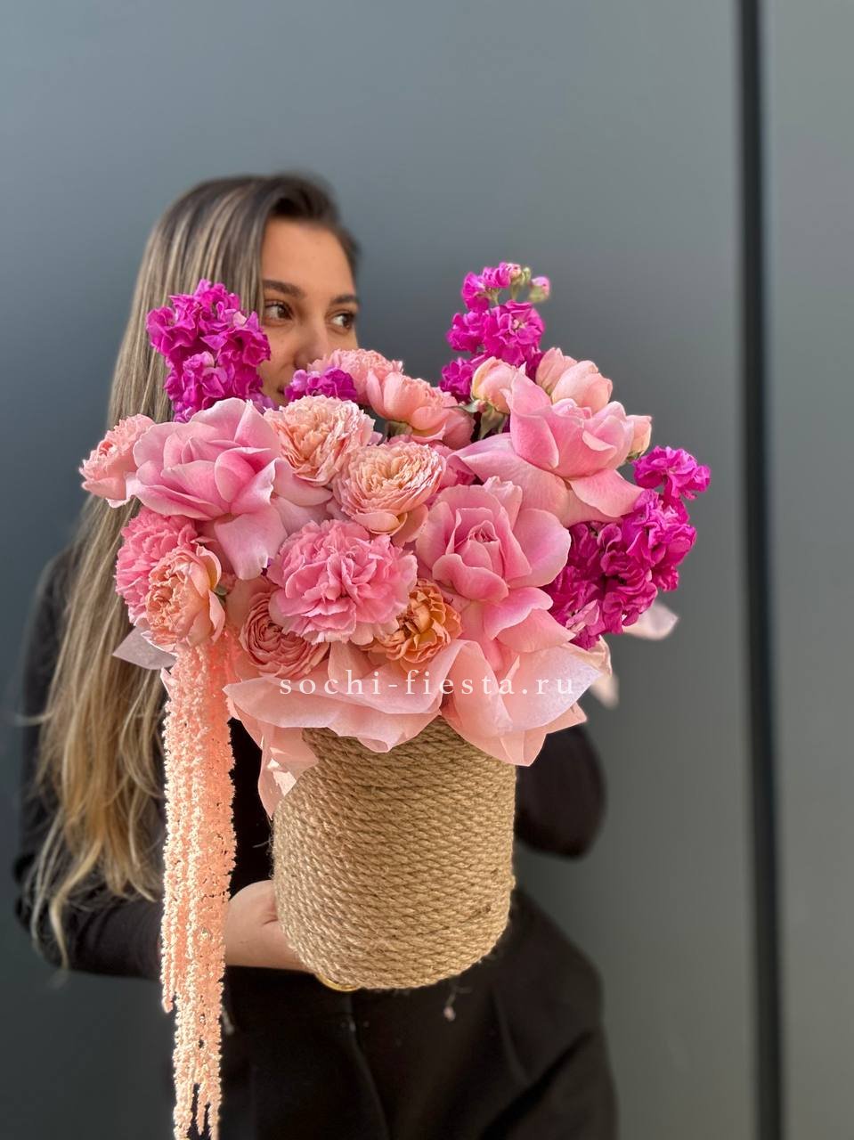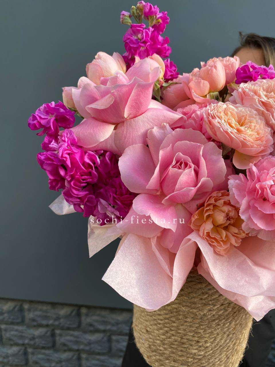 Яркий джутовый бокс в составе которого: маттиола, французские розы, кустовые пионовидные розы, дианутсы, амарантус.
