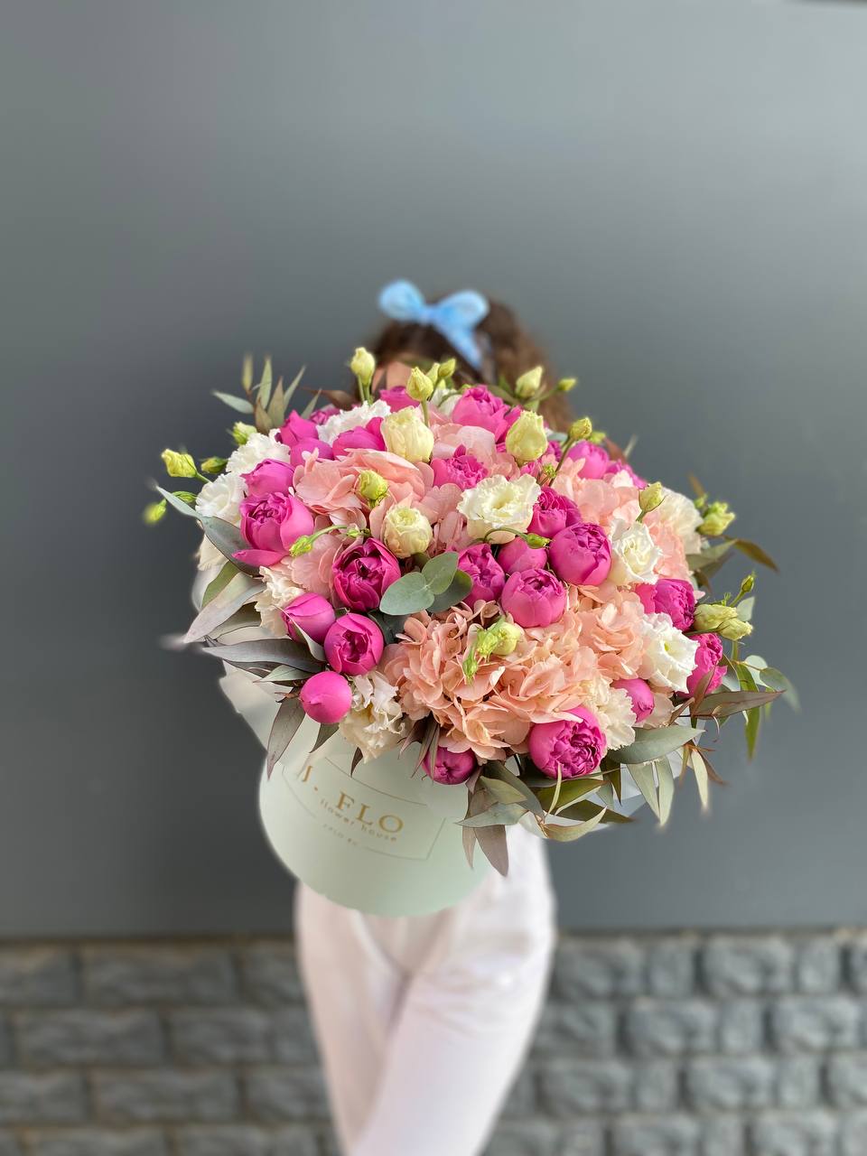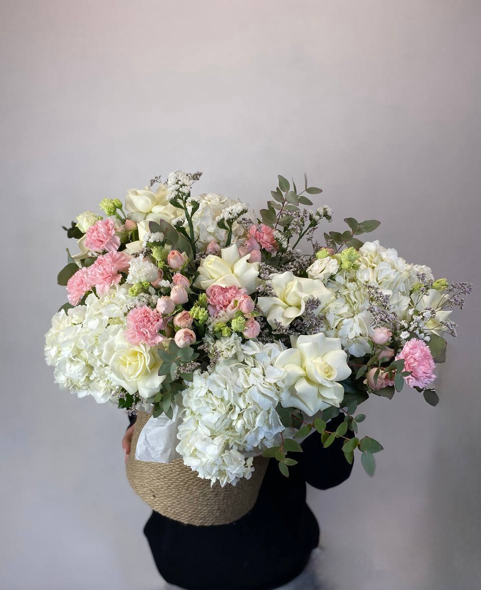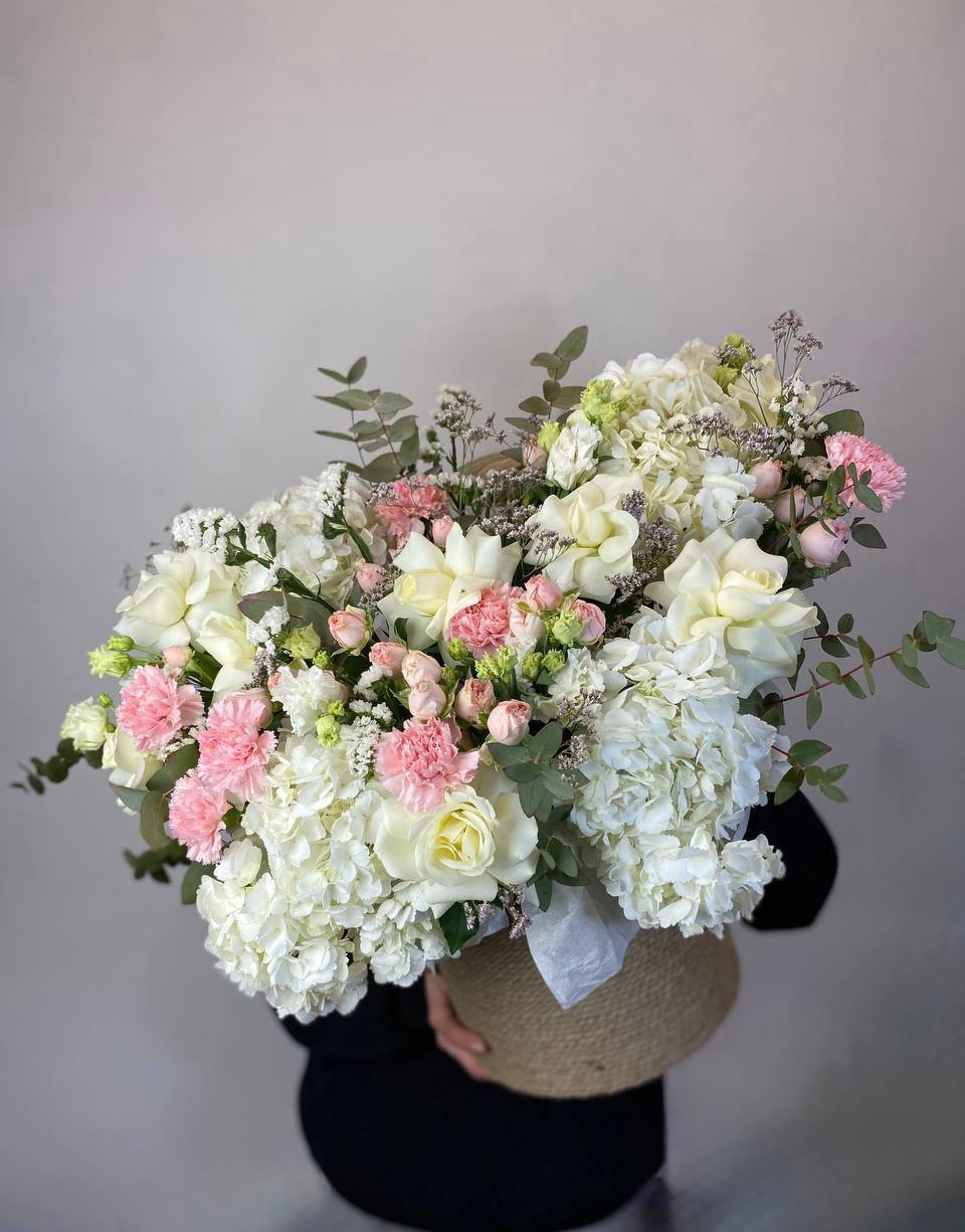 Белоснежные розы и воздушная гортензия создают объёмную композицию с мягкими переходами оттенков. Эустома и диантус добавляют фактурности, а лимониум заполняет пространство между крупными бутонами.