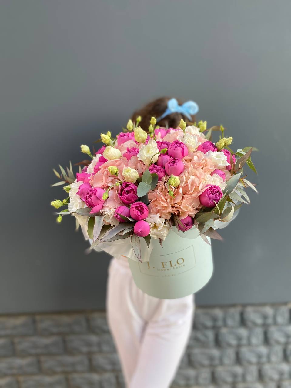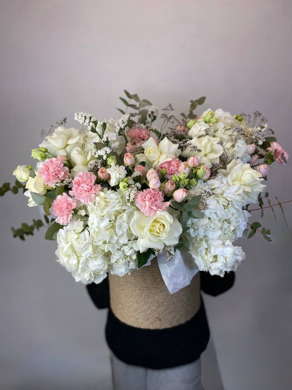 гортензия, белые розы, диантус, бомбастик, эустома, лимониум, эвкалипт, бокс 25 в джуте.