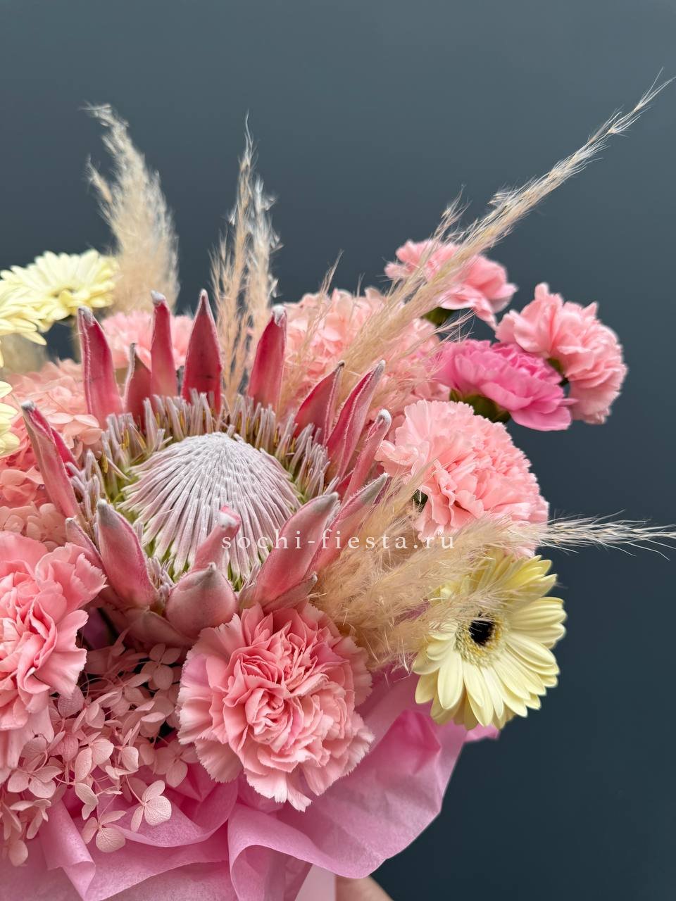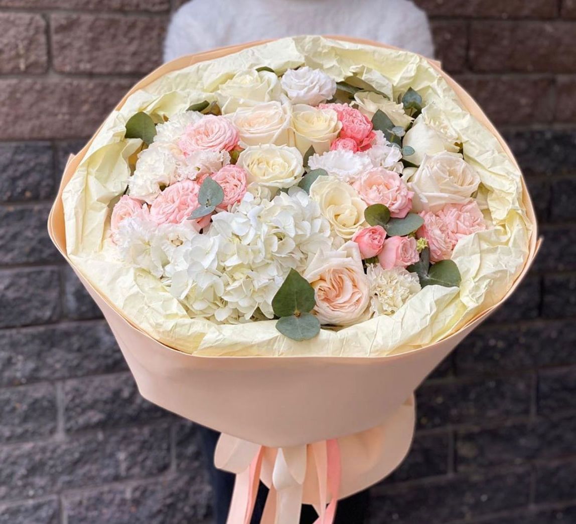 Состав: эустома, розы, пионовидные розы, озотамнус или аналог, диантусы, макаронс, декоративная зелень, коробка-сердце