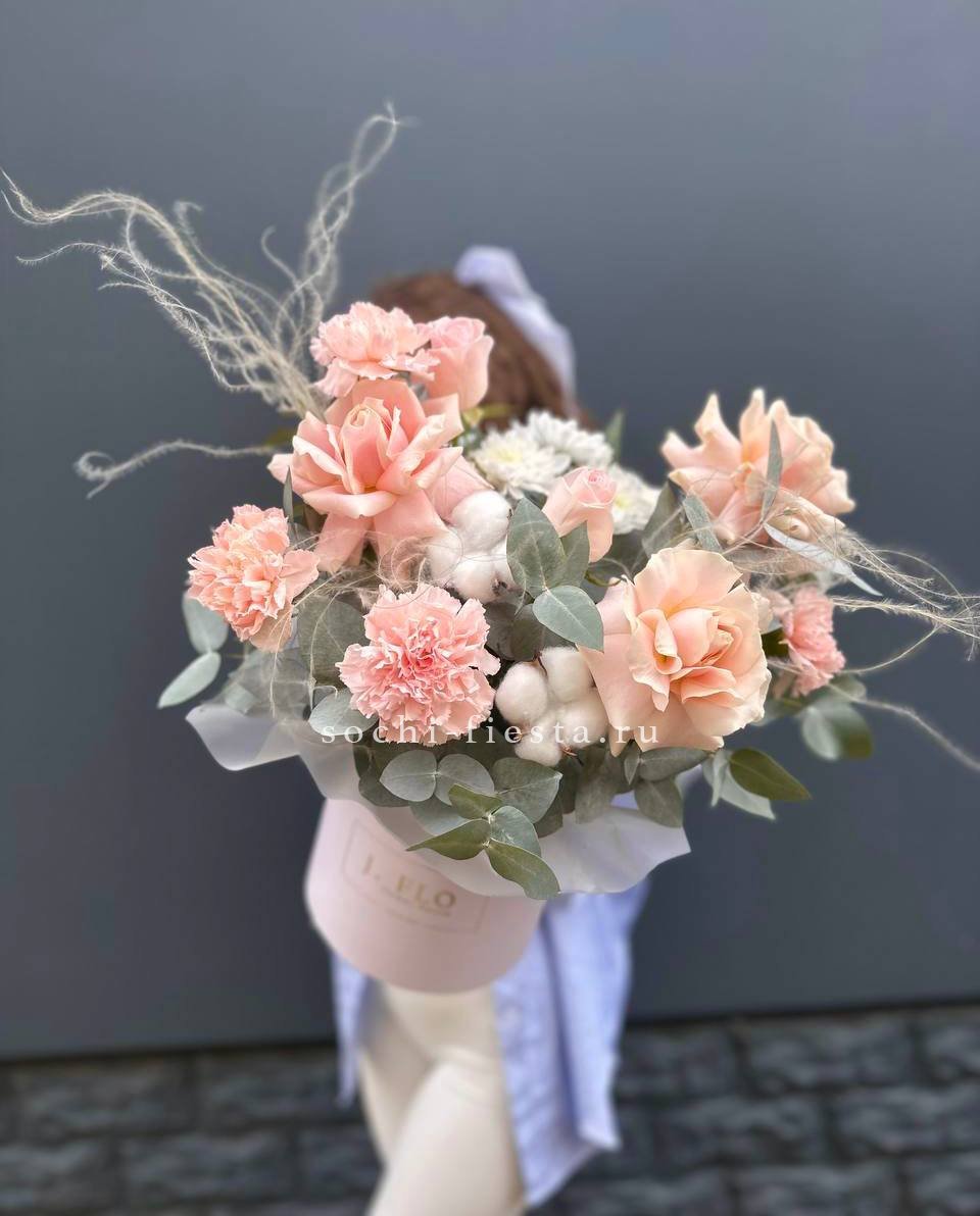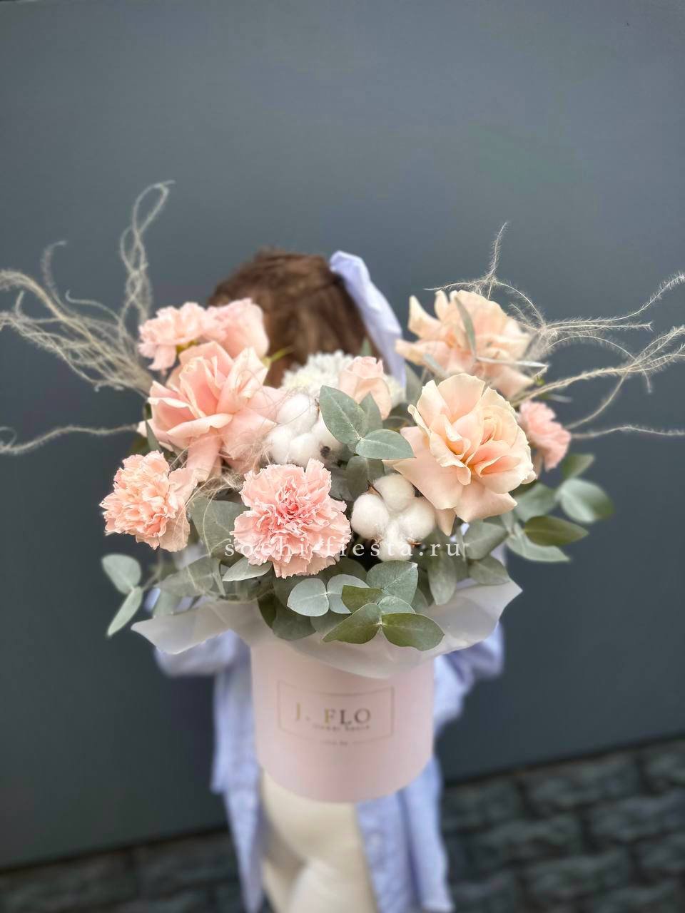 Состав: розы, диантусы в нежных оттенках, розовая круглая коробка D20, 6 макаронс