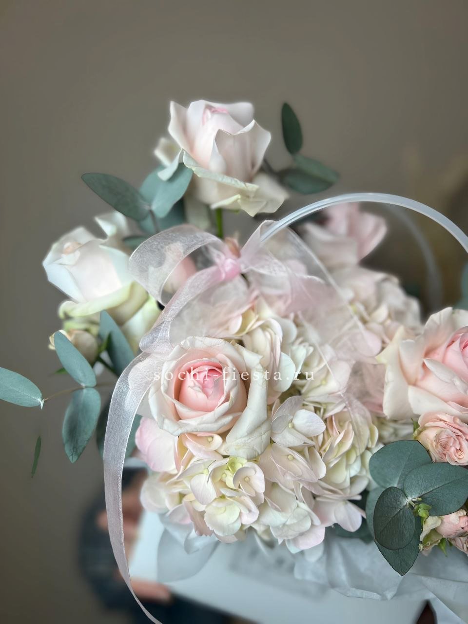 Состав: гортензия, розовые розы, пионовидные розы, диантус, эвкалипт, лента, сумка-кашпо