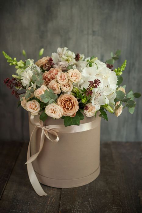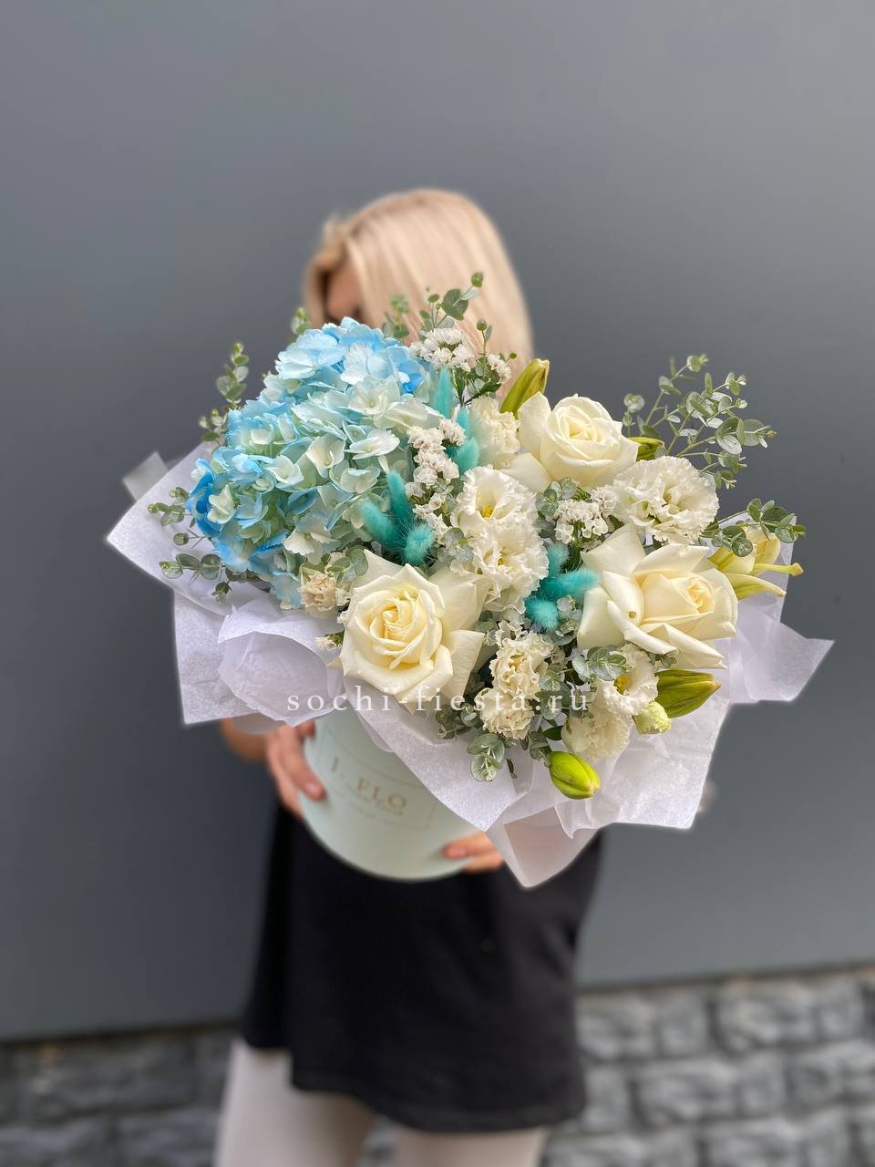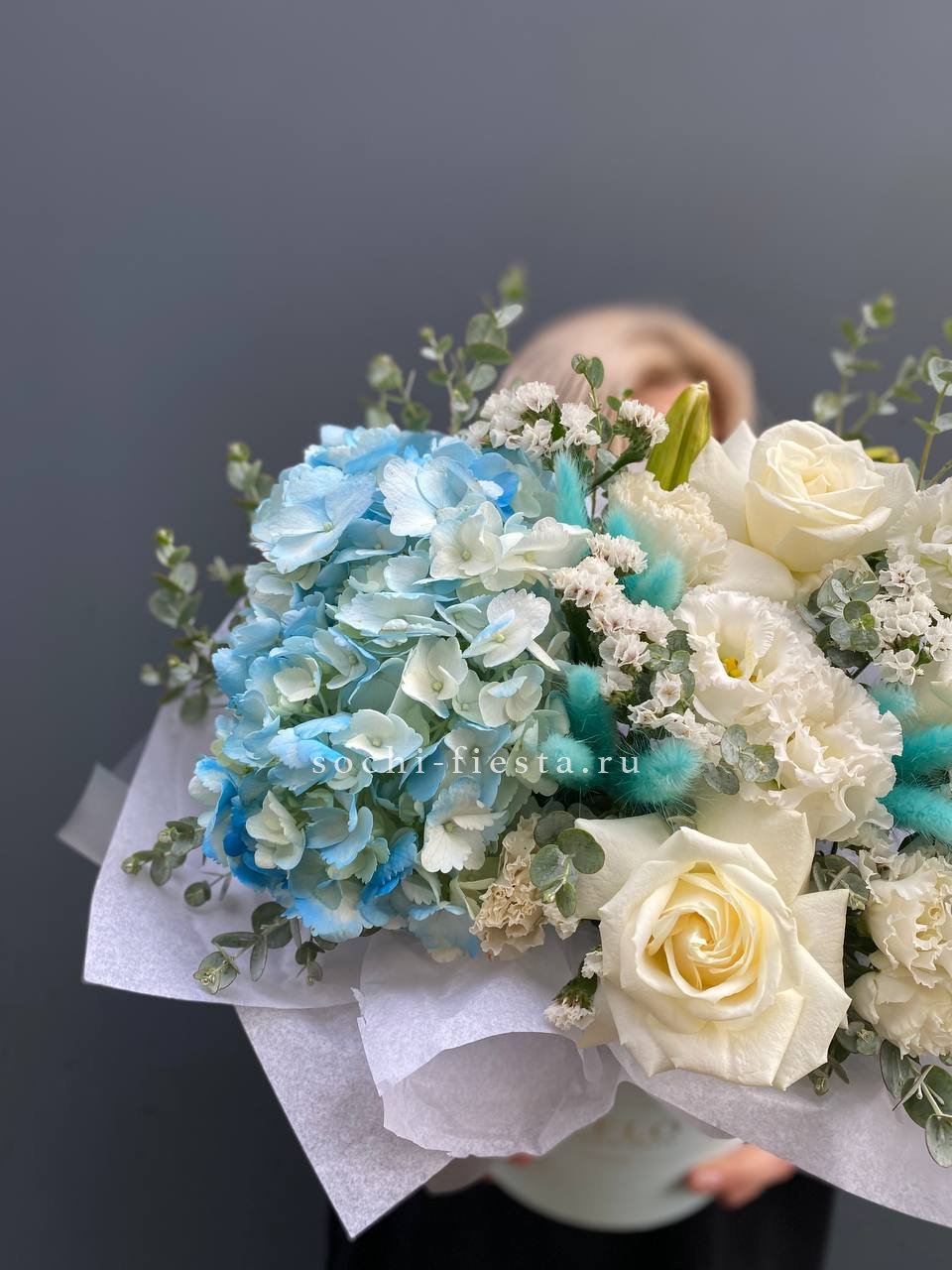 Состав: гортензия розовая 1шт., диантус 3шт., роза одноголовая - 3 шт., ранункулюс или пионовидная кустовая роза 8шт., лента, сумка-кашпо