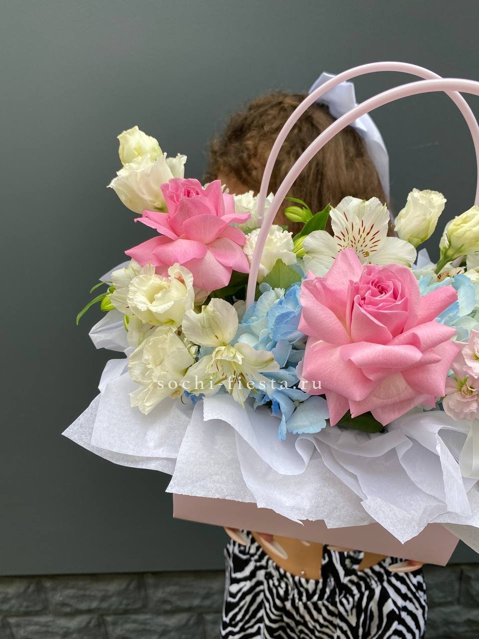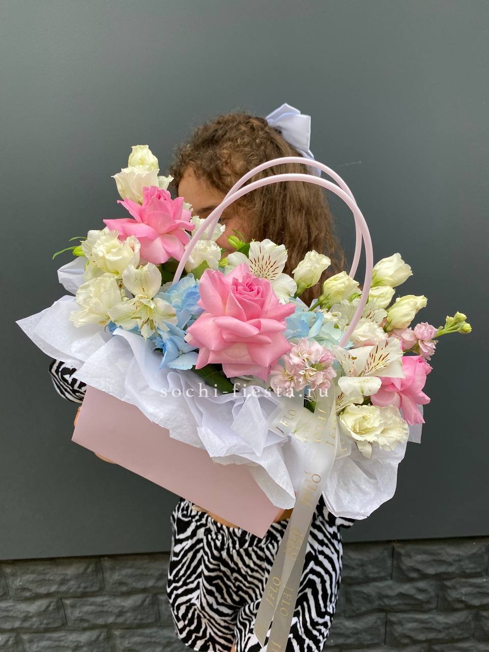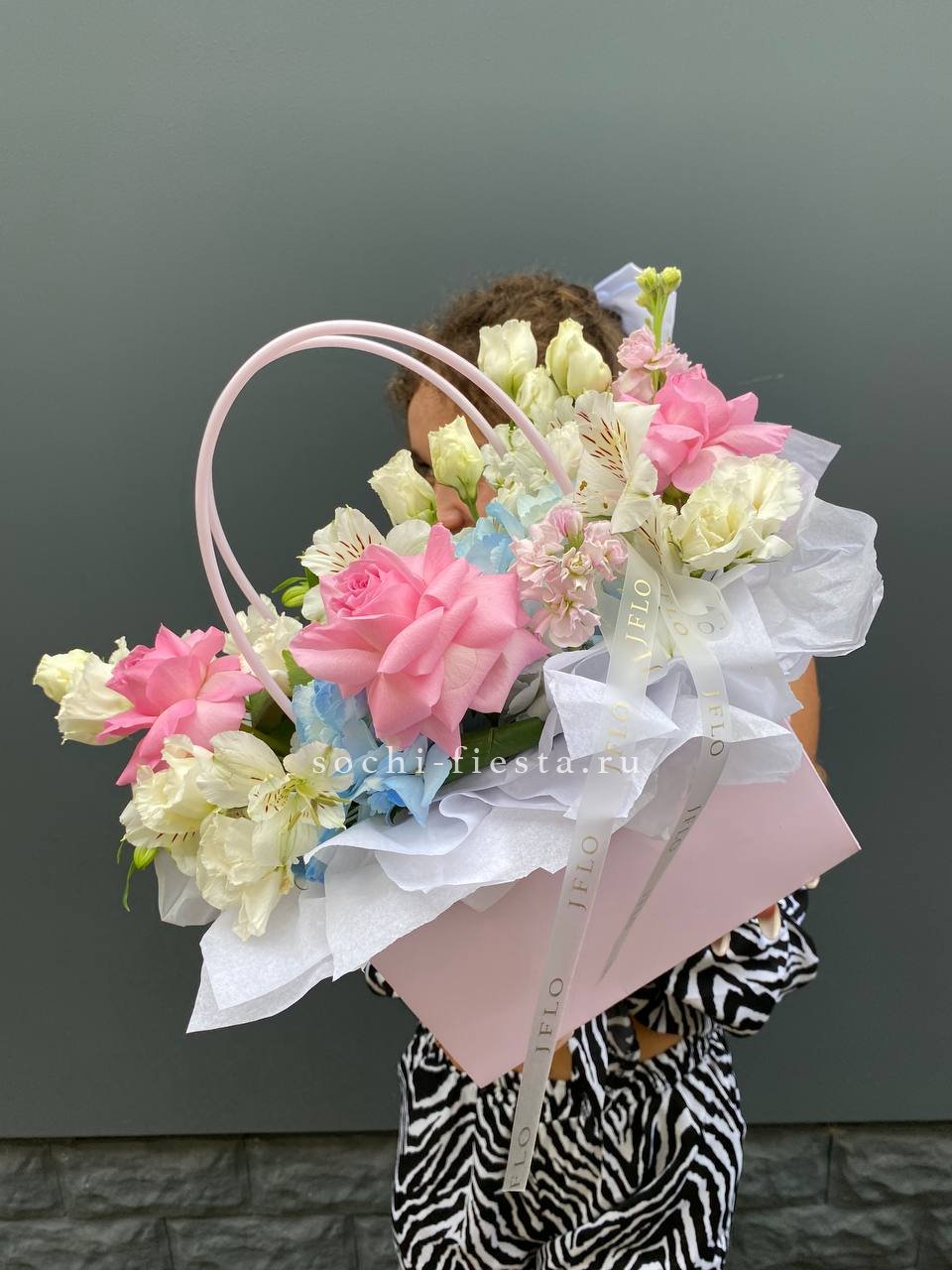 Состав: альстромерию, эустома, розовые роза, эвкалипт, лента, сумка-кашпо