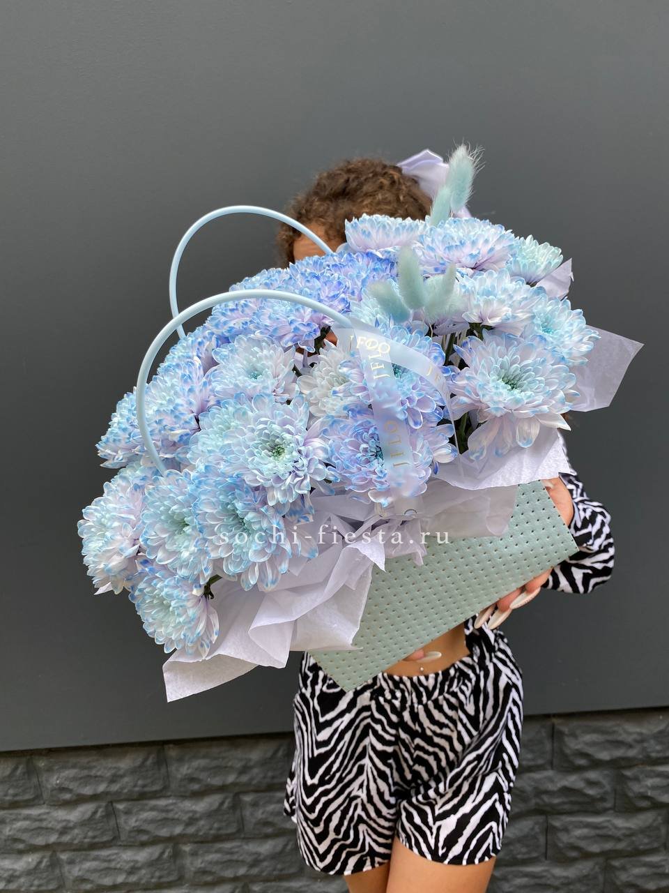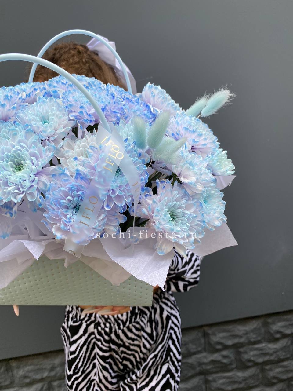 Состав: хризантема голубая, лагурус, сумочка