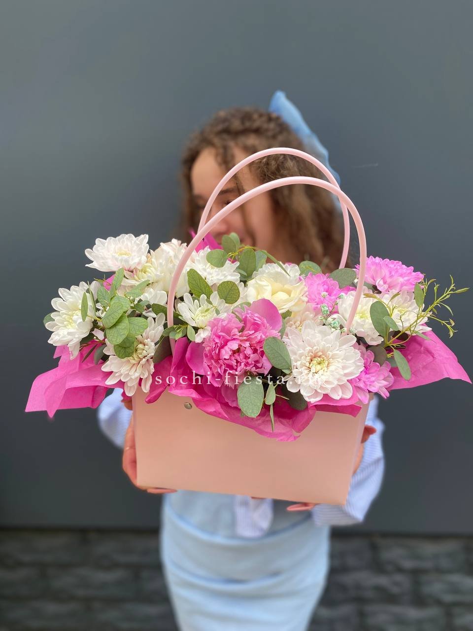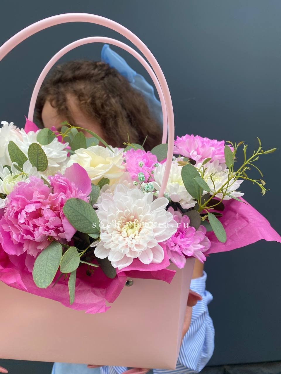 Состав: хризантемы, пионы, лента, сумка-кашпо.
