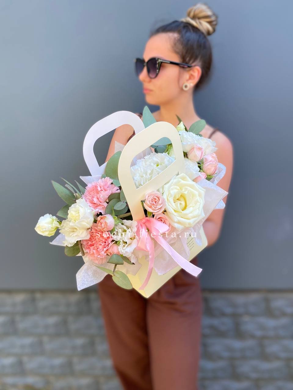 Состав: эустома, кустовые розы, белые розы, диантусы, лента, сумка-кашпо.