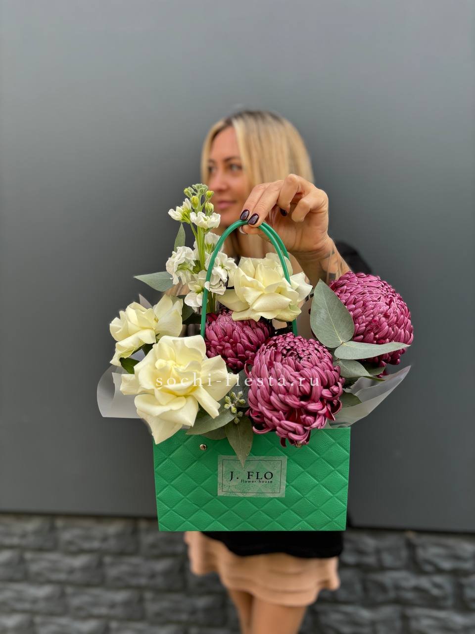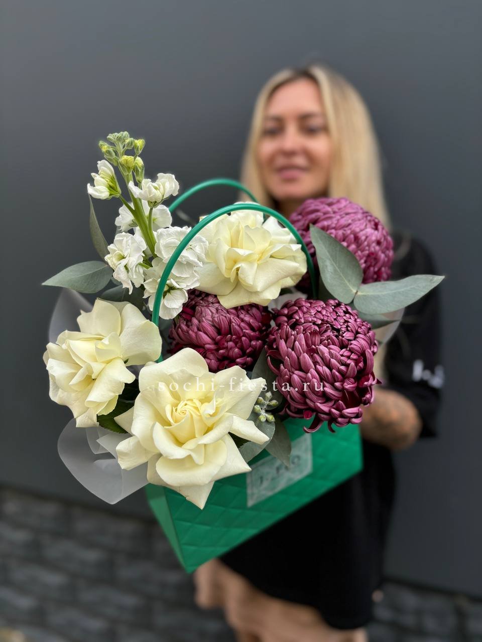 Состав: хризантемы бигуди, маттиола, розы,  эвкалипт, сумка