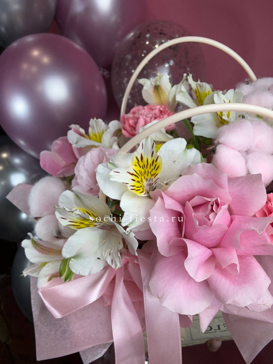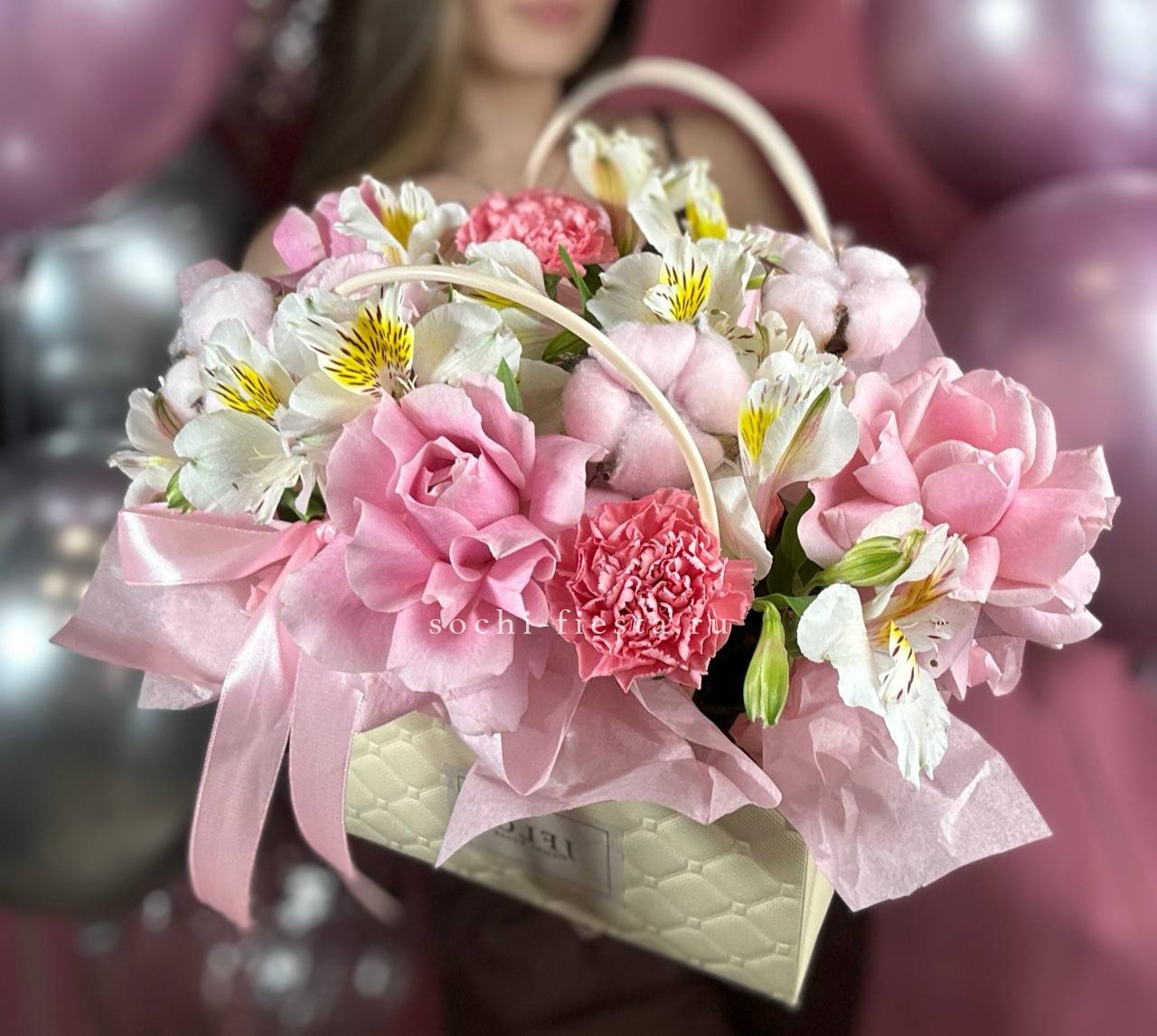 Состав: альстромерии (в зависимости от сезона, возможна замена), розовые розы, хлопок, диантусы, лента, сумка-кашпо