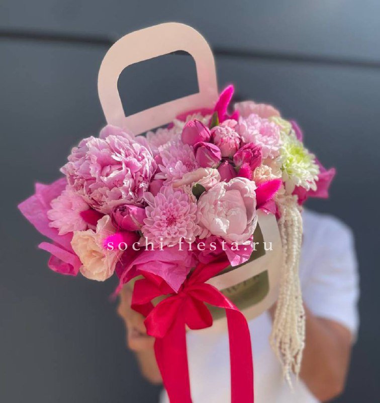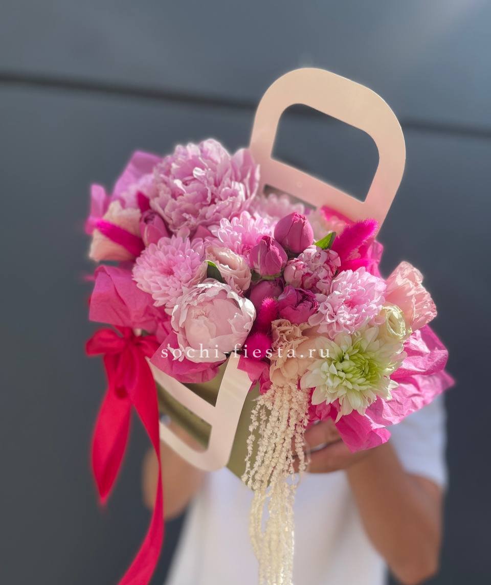 Состав: пионы, хризантемы,кустовые розы,лагурус, лента, сумка-кашпо.