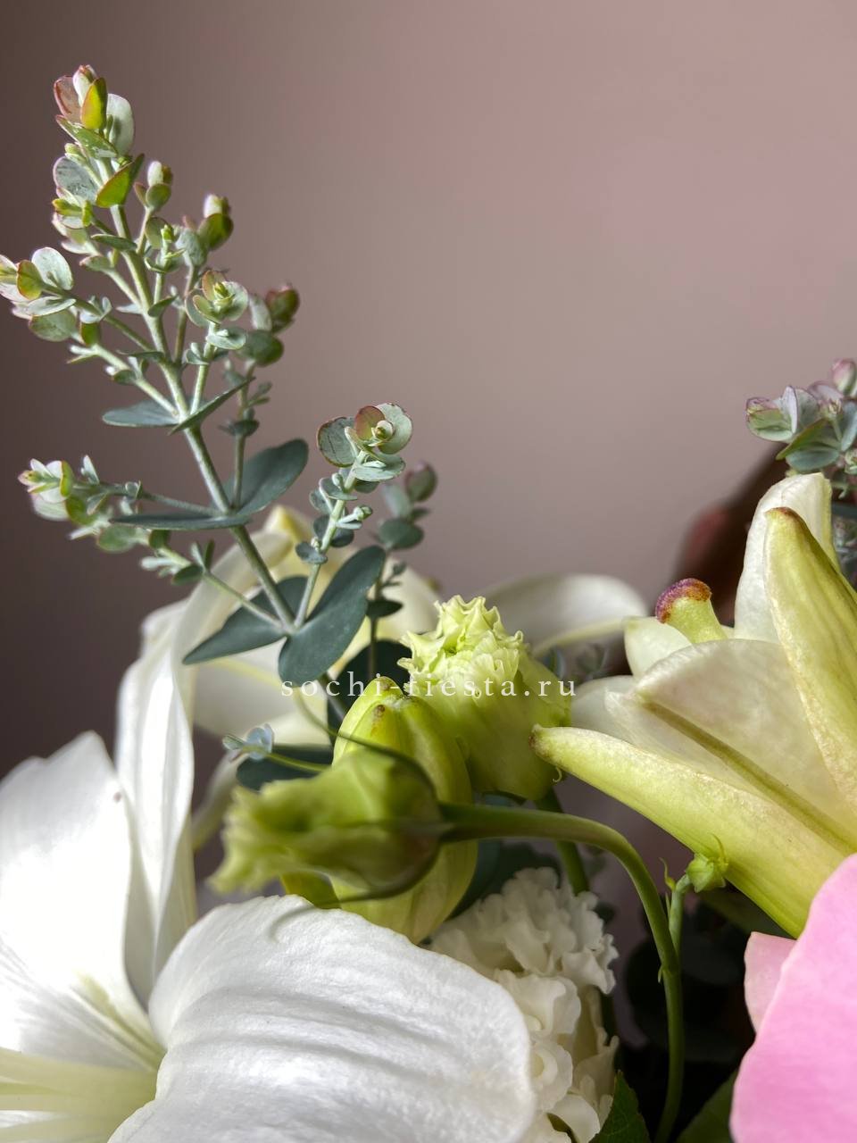 Состав: нежная композиция на базе оазиса с применением одноголовых роз, эустомы, лилий, эвкалипта, упаковки