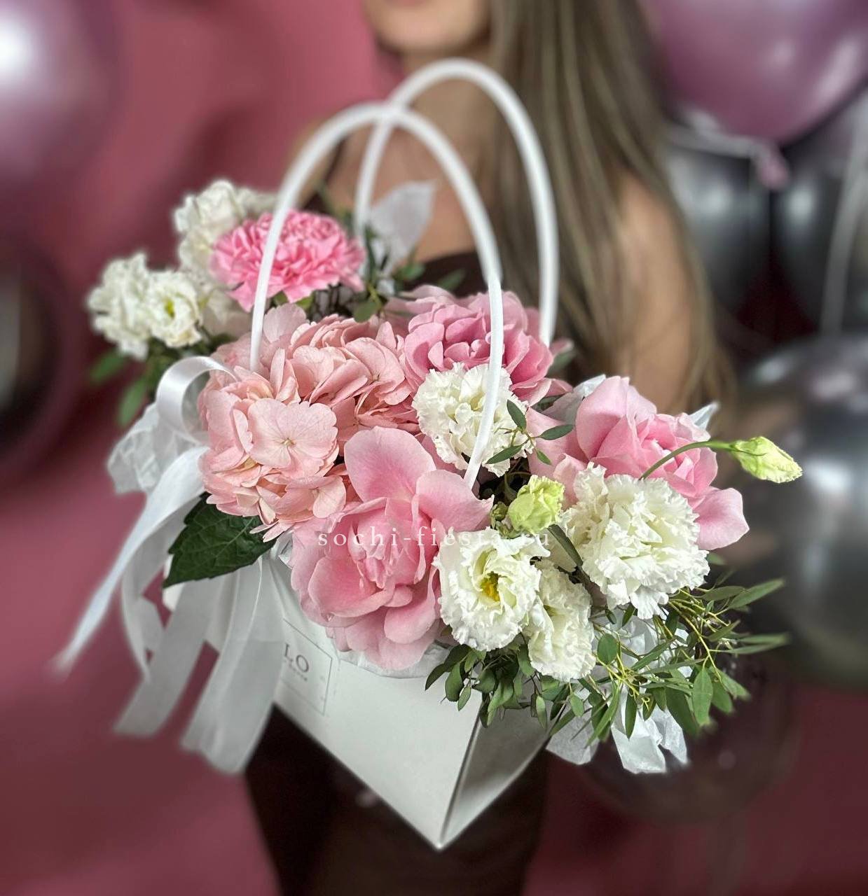 Состав: гортензия, розовые розы, эустома, диантусы,эвкалипт, лента, сумка-кашпо.